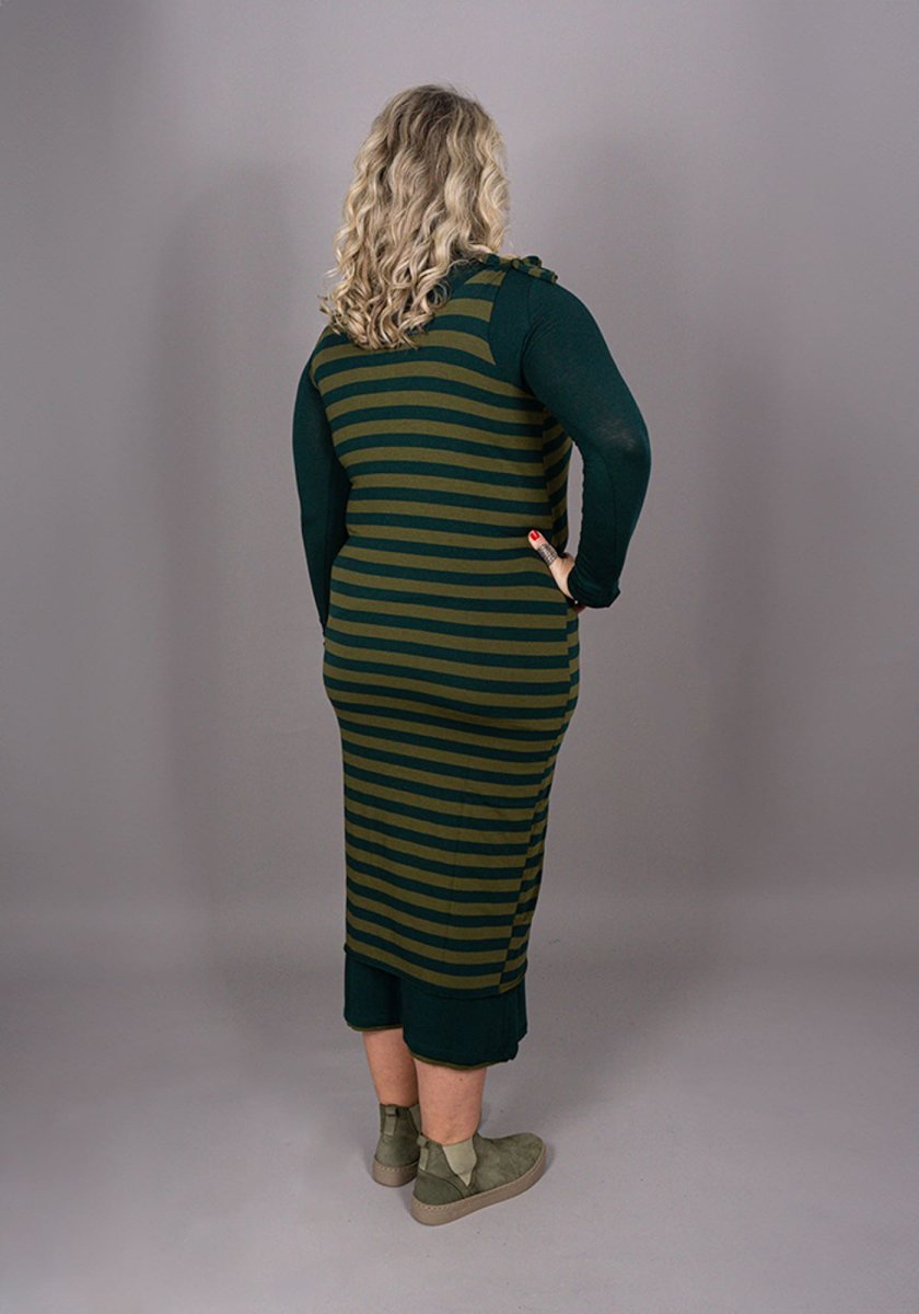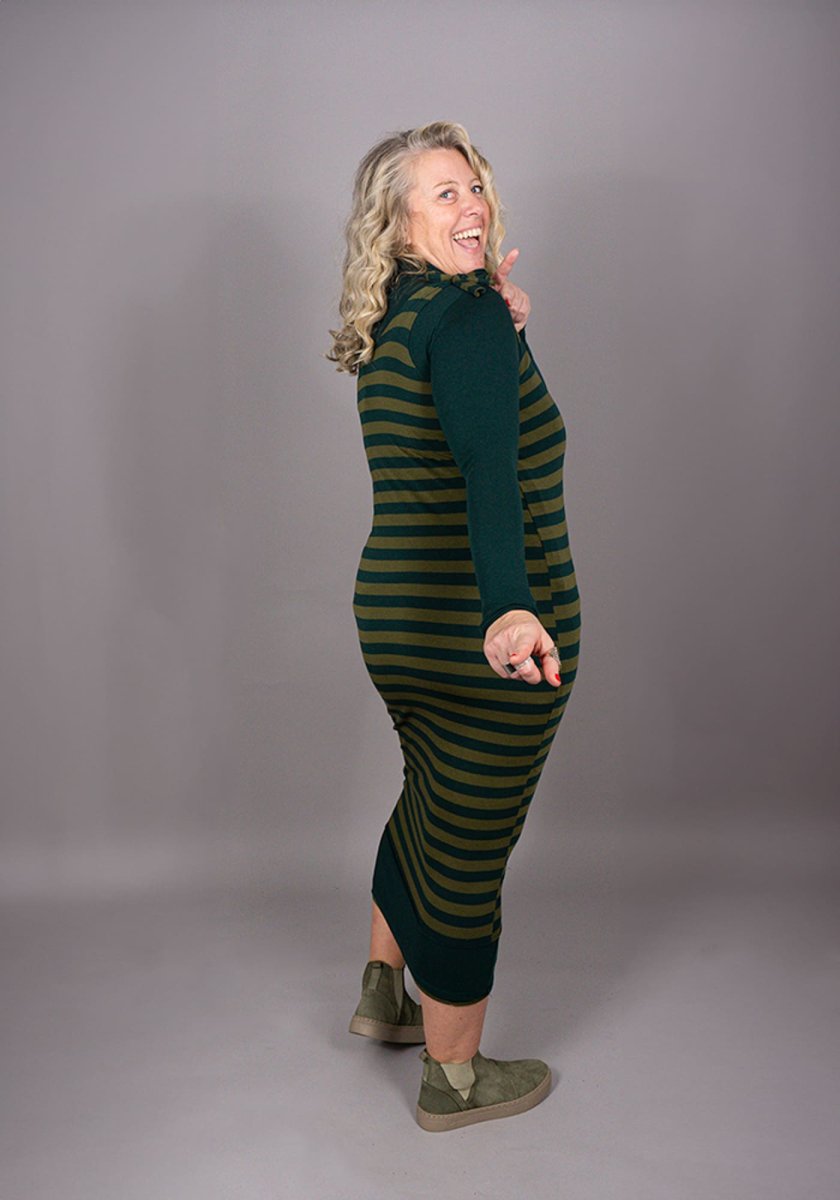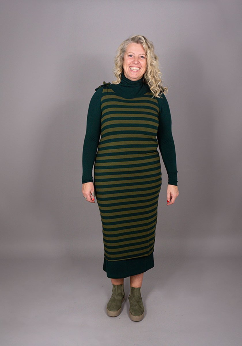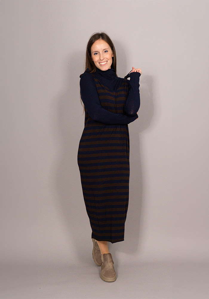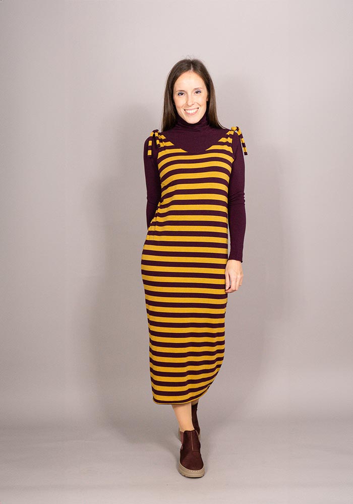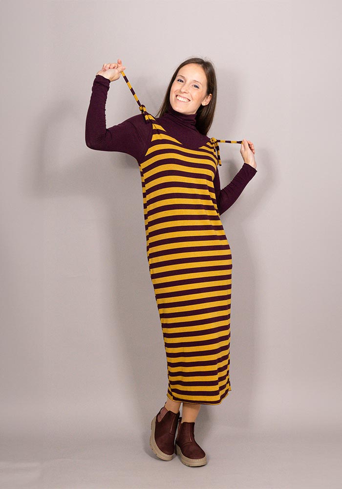 L’abito a tubino, realizzato con in modal e lana dal design pulito con i fiocchetti sulle spalle da poter regolare l’altezza dello scollo e la lunghetta dell’abito, si distingue per la sua versatilità, rendendolo adatto a svariate occasioni.
