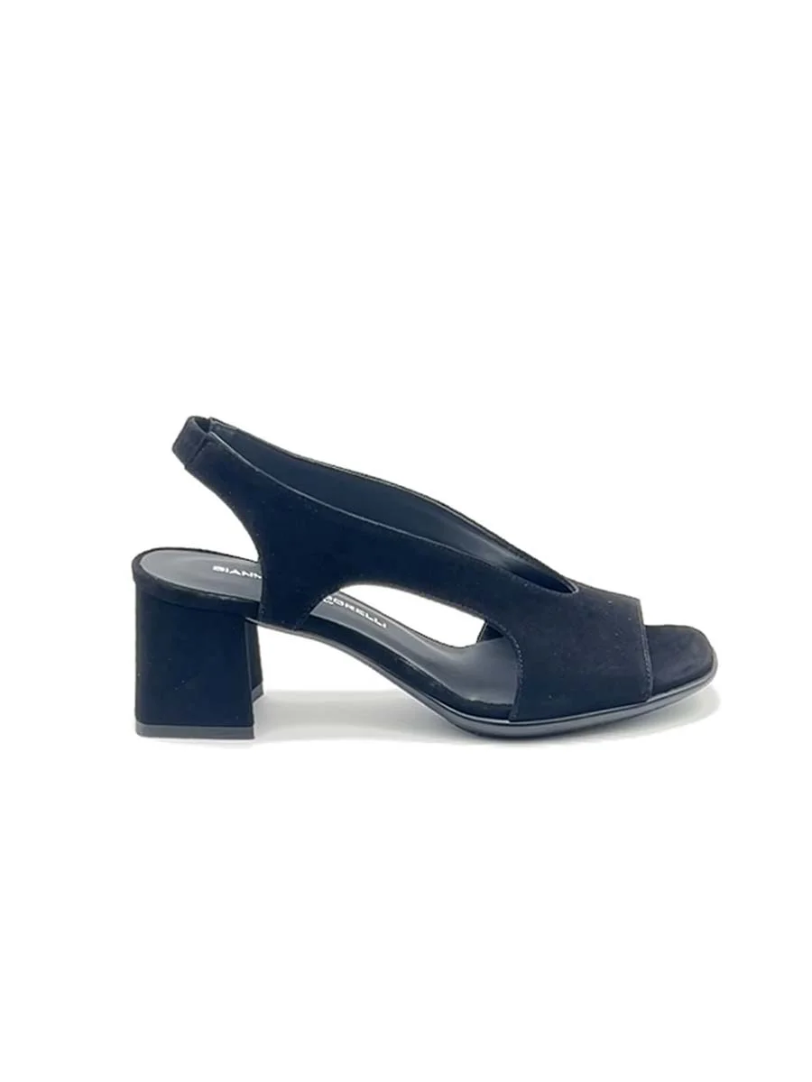 Si chiama “Alba” il nuovo sandalo di “Gianmarco Sorelli”, dalla forma squadrata realizzato in morbido camoscio nero, caratterizzato dallo scollo a “V”. Tacco cm 5, il fondo è in cuoio, sottopiede in vera pelle.