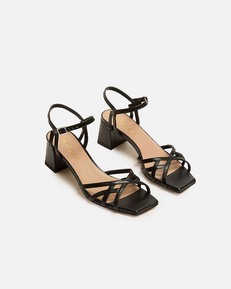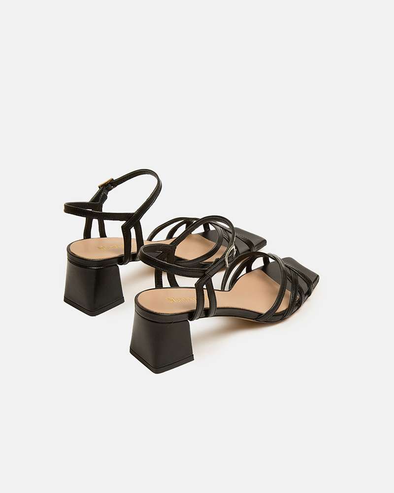 Sandalo in pelle , cinturino caviglia e fasce intrecciate Colore nero Tacco fasciato pelle altezza 5 cm Fodere interne in pelle Sottopiede in pelle Fondo in cuoio Prodotto interamente fabbricato in Italia