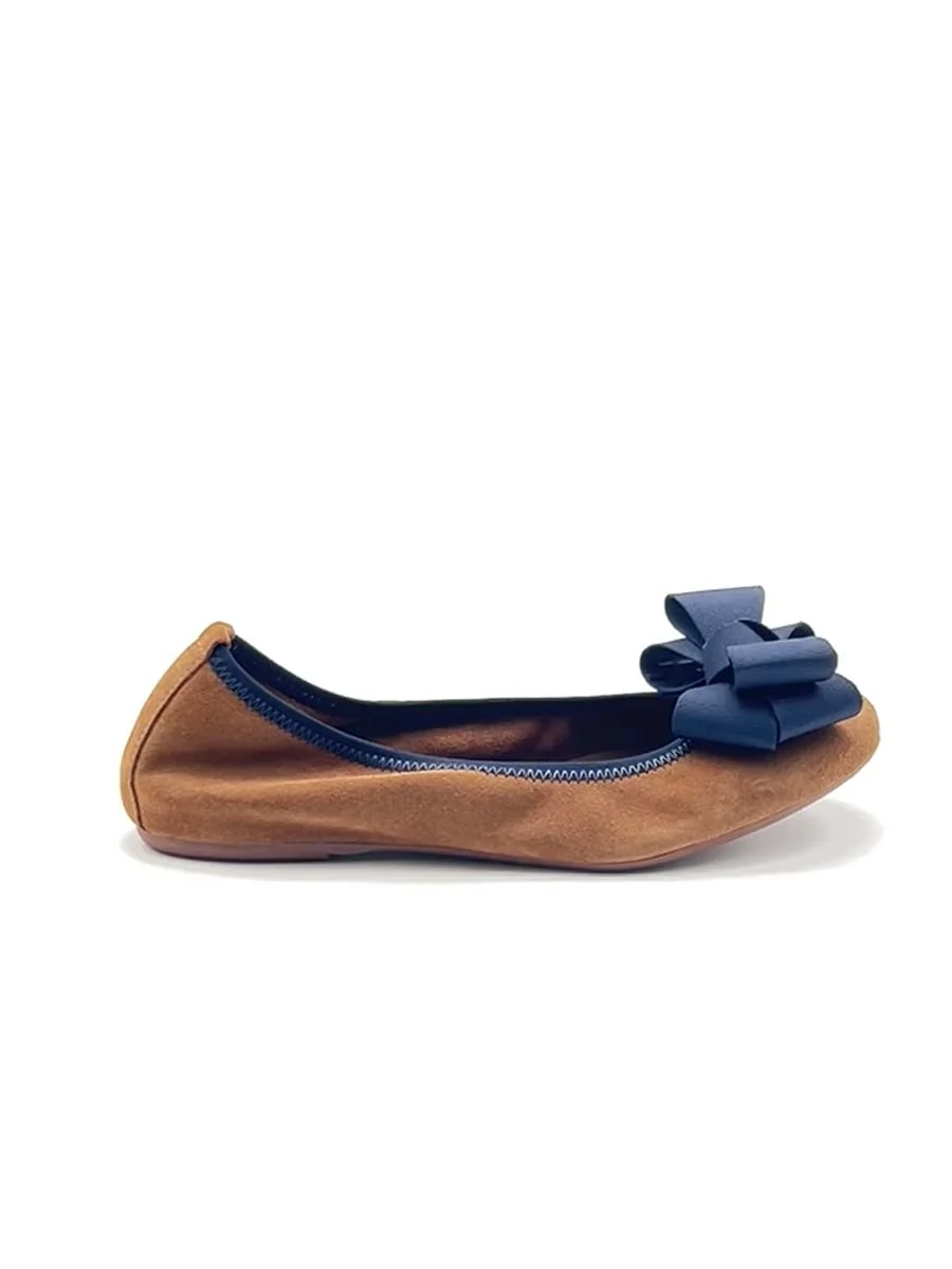 Si chiama “Alice” la nostra ballerina con rialzo interno anti tallonite di 1,5 cm. Realizzata in morbido camoscio cuoio con fiocco in gros grain a contrasto blu navy. Il fondo è in gomma. Si consiglia una taglia in più.