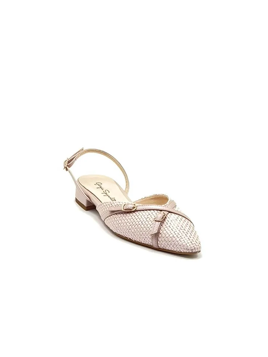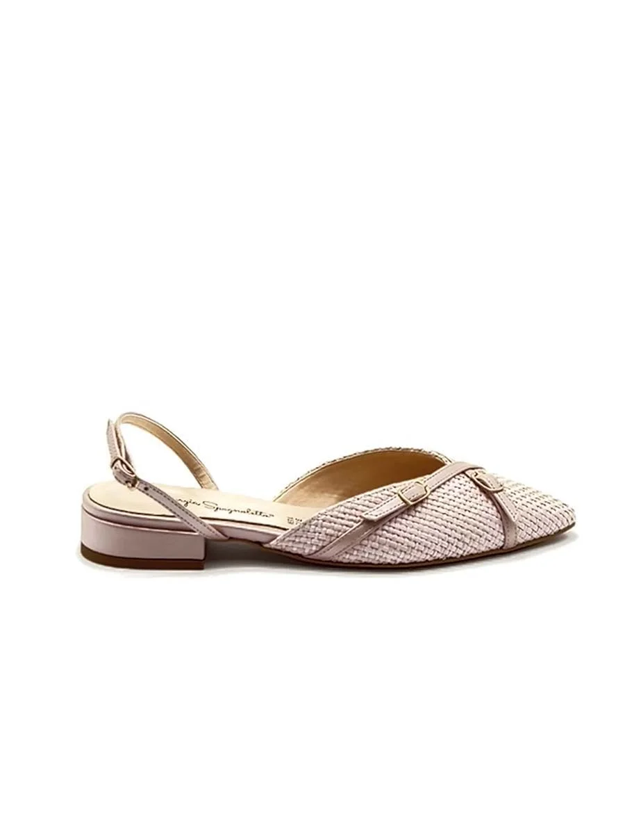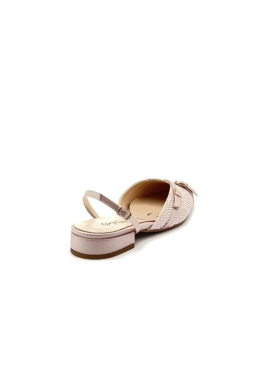 Si chiama “Amalia” il nuovo Slingback di questa stagione, dalla forma a punta realizzato in morbida rafia cipria con cinturini in nappa perlata tono su tono. Tacco largo cm 1.