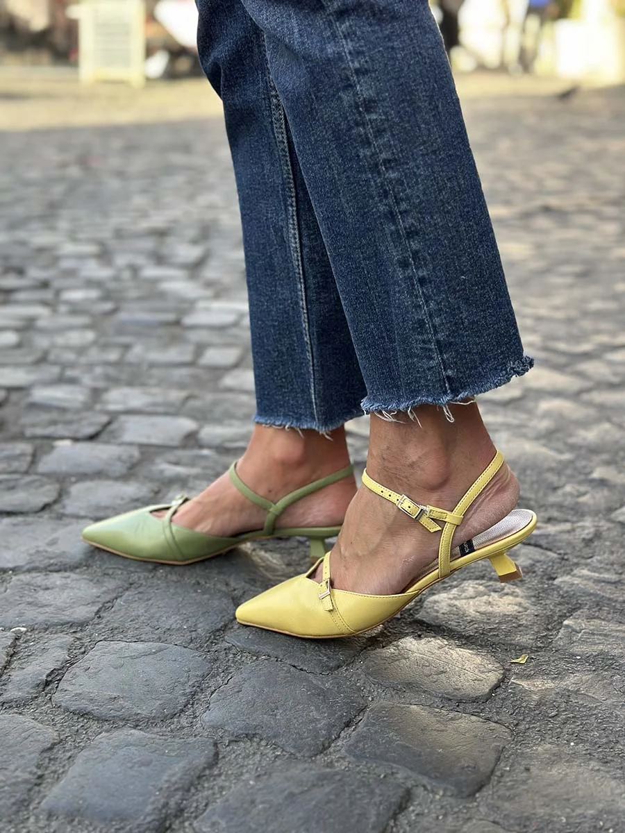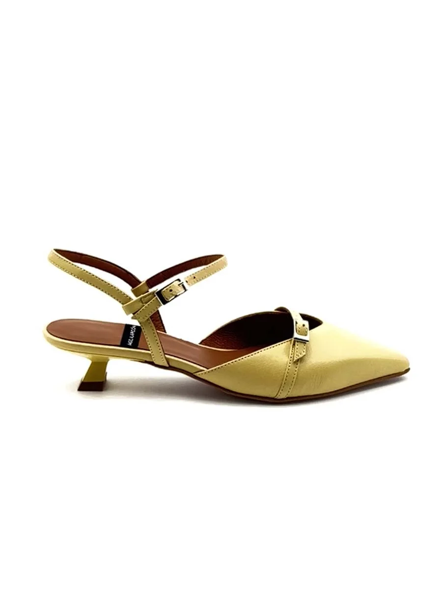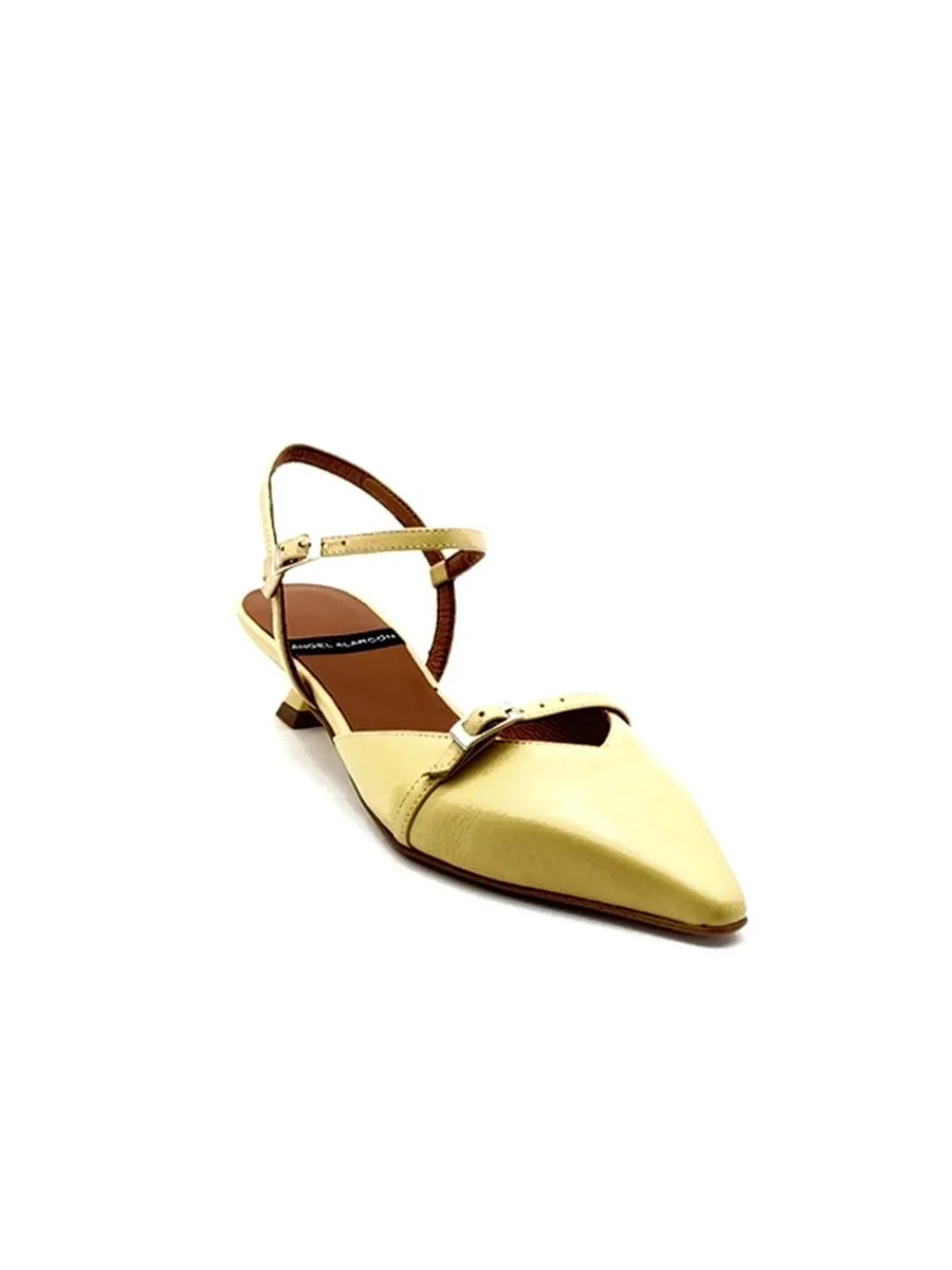 Si chiama “Amandine” il nuovo modello di Angel Alarcon. Slingback dalla forma a punta realizzato in morbida nappa gialla con sottile cinturino regolabile alla caviglia. Tacco cm 3, il fondo è in cuoio.