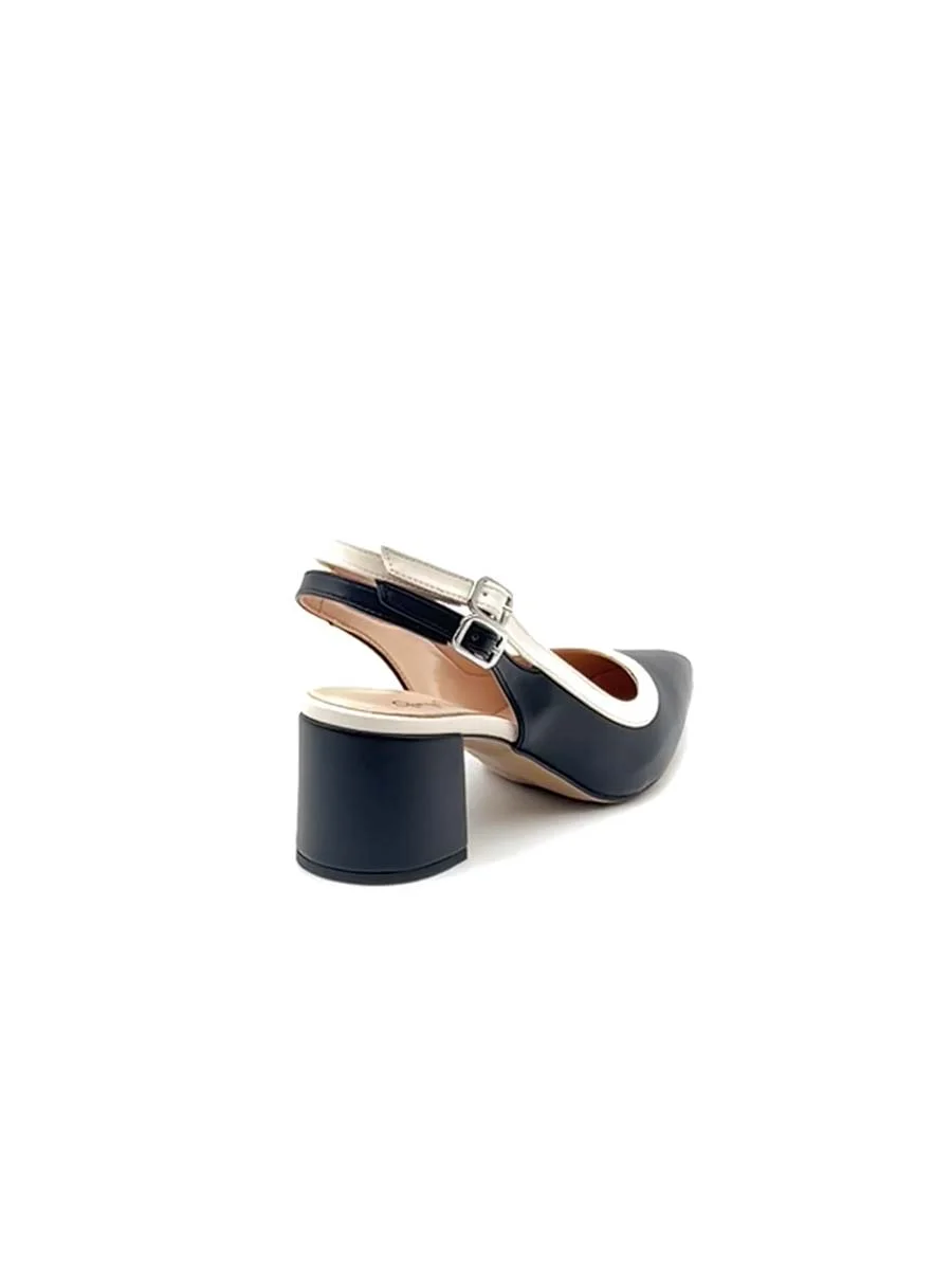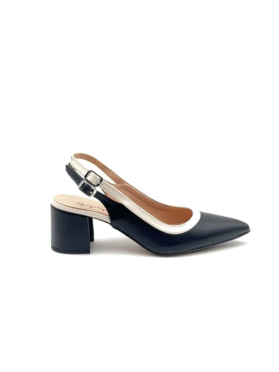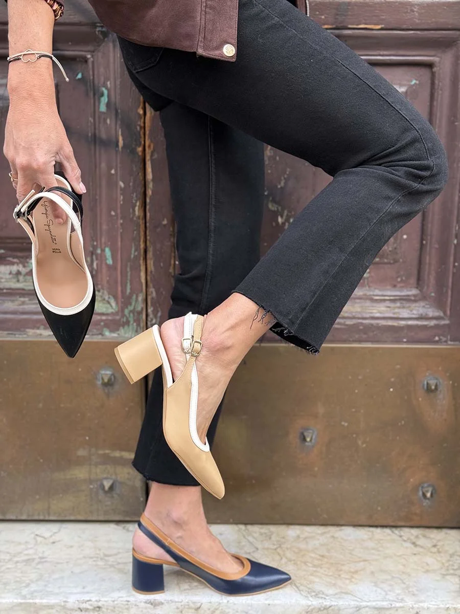 Si chiama “Amelie” il nuovo Slingback di questa stagione dalla forma a punta realizzato in morbida nappa nera, con doppio cinturino regolabile a contrasto burro. Tacco largo cm 5, il fondo è in cuoio.