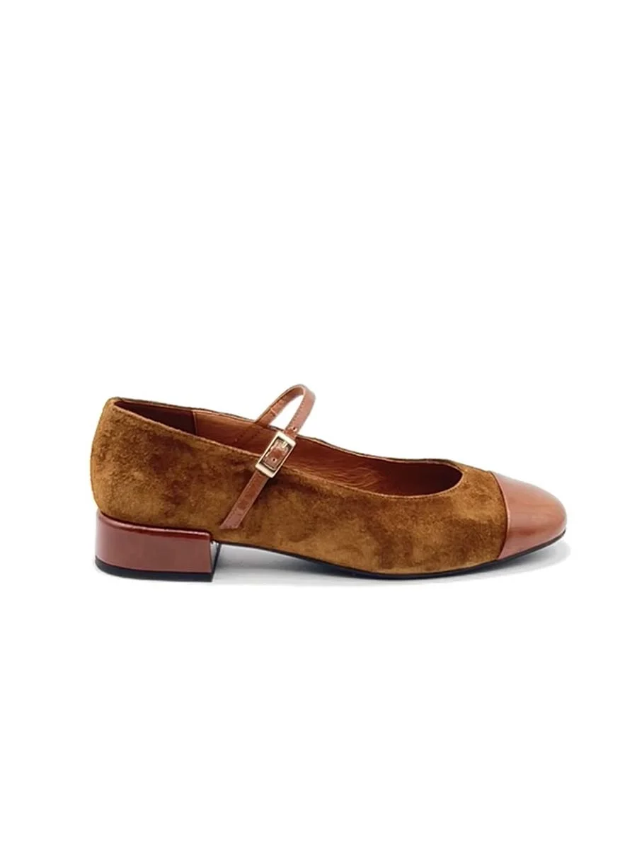 Si chiama “Amira” il nuovo modello di Angel Alarcon, Mary Jane dalla forma stondata realizzato in morbido camoscio tabacco, con punta e tacco in vernice tono su tono. Tacco cm 3, il fondo è in gomma.