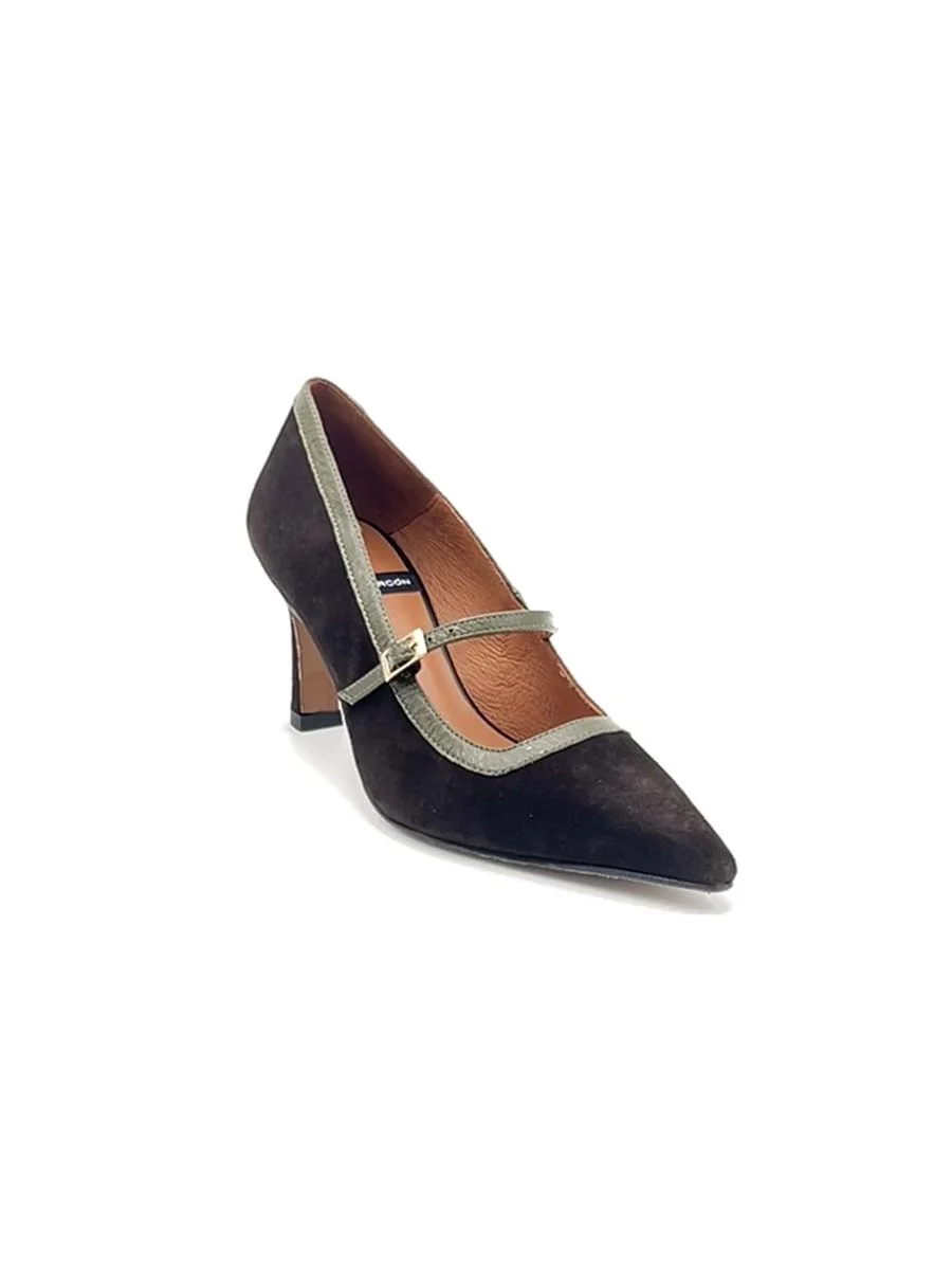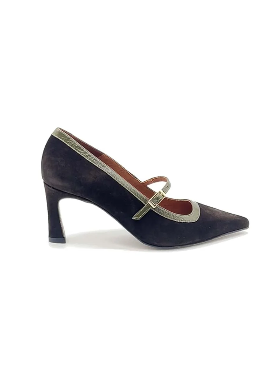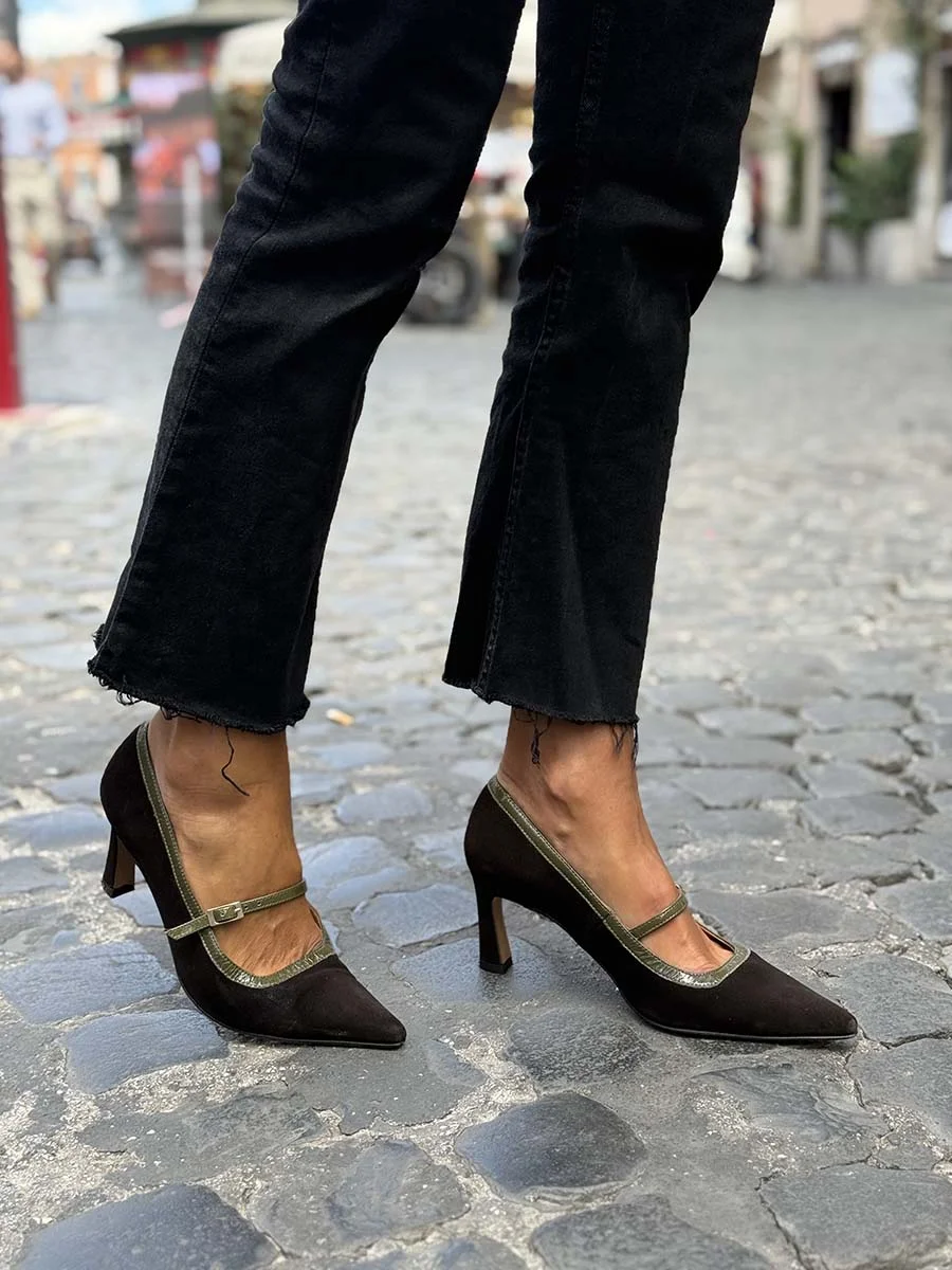 Si chiama “Ariane” il nuovo modello di Angel Alarcon, Mary Jane dalla forma a punta realizzato in morbido camoscio testa di moro, con profili e cinturino a contrasto in vernice verde. Tacco cm 7, il fondo è in gomma.