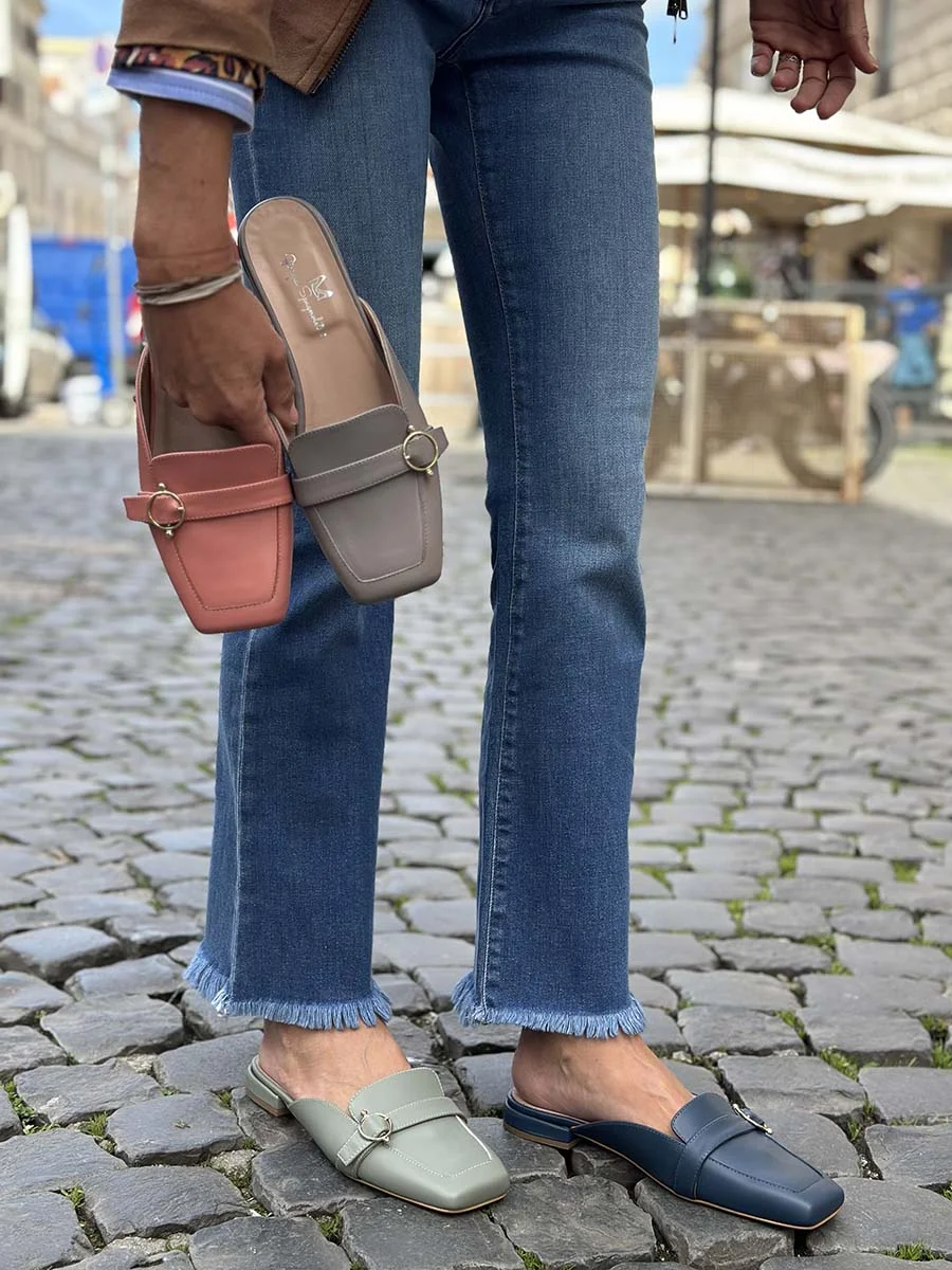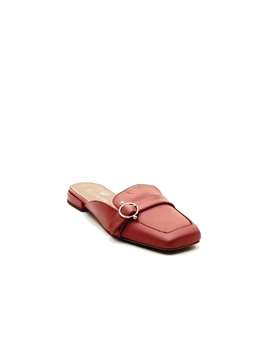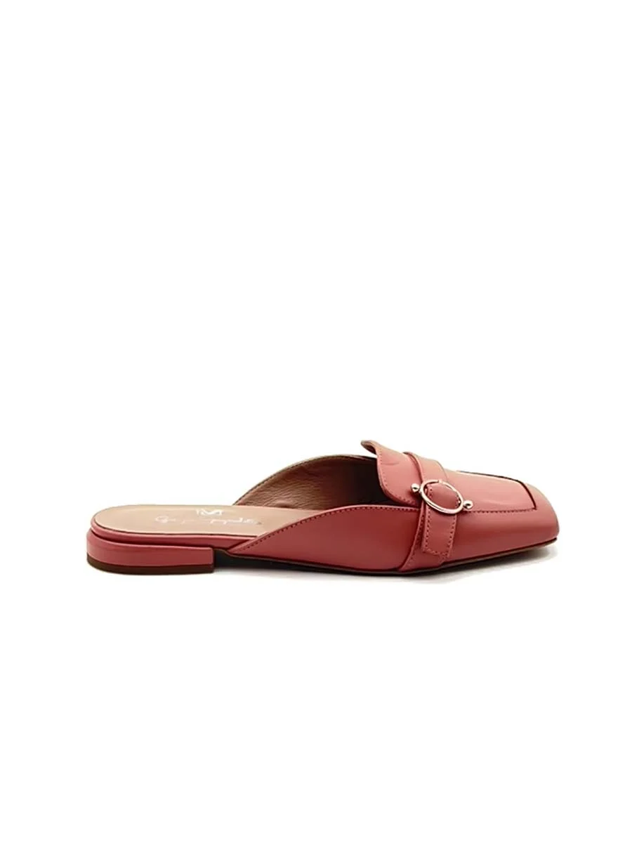 Si chiama “Audrey” il nuovo mules di questa stagione, dalla forma squadrata, realizzata in morbida nappa corallo con fibbia ad anello cromata oro. Tacco cm 1, il fondo è in cuoio.