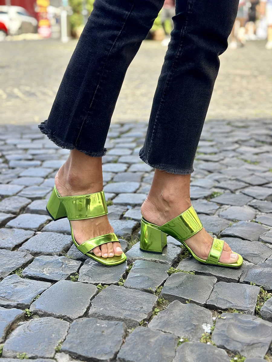 Si chiama “Barbara” il nuovo sabot di questa stagione dalla forma squadrata realizzato in morbida pelle specchio verde con fasce sul collo del piede. Tacco cm 5, il fondo è in cuoio.