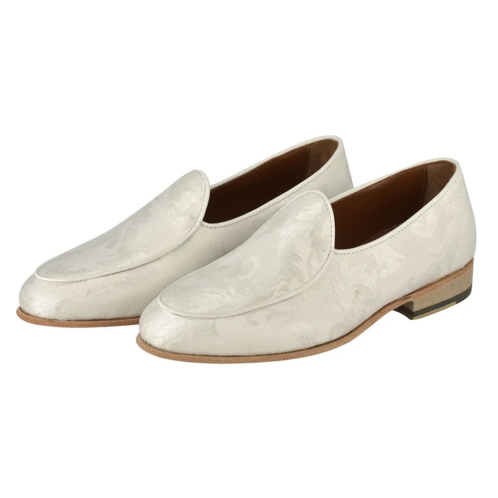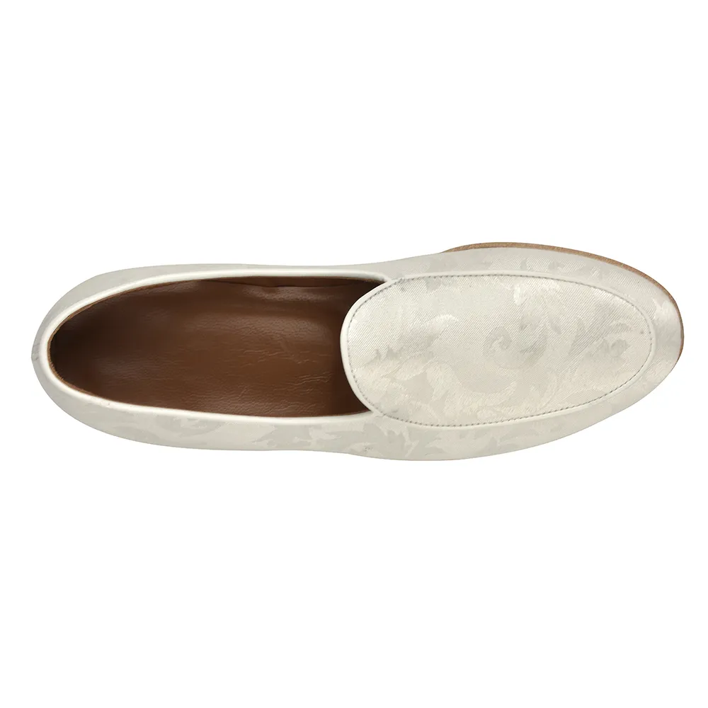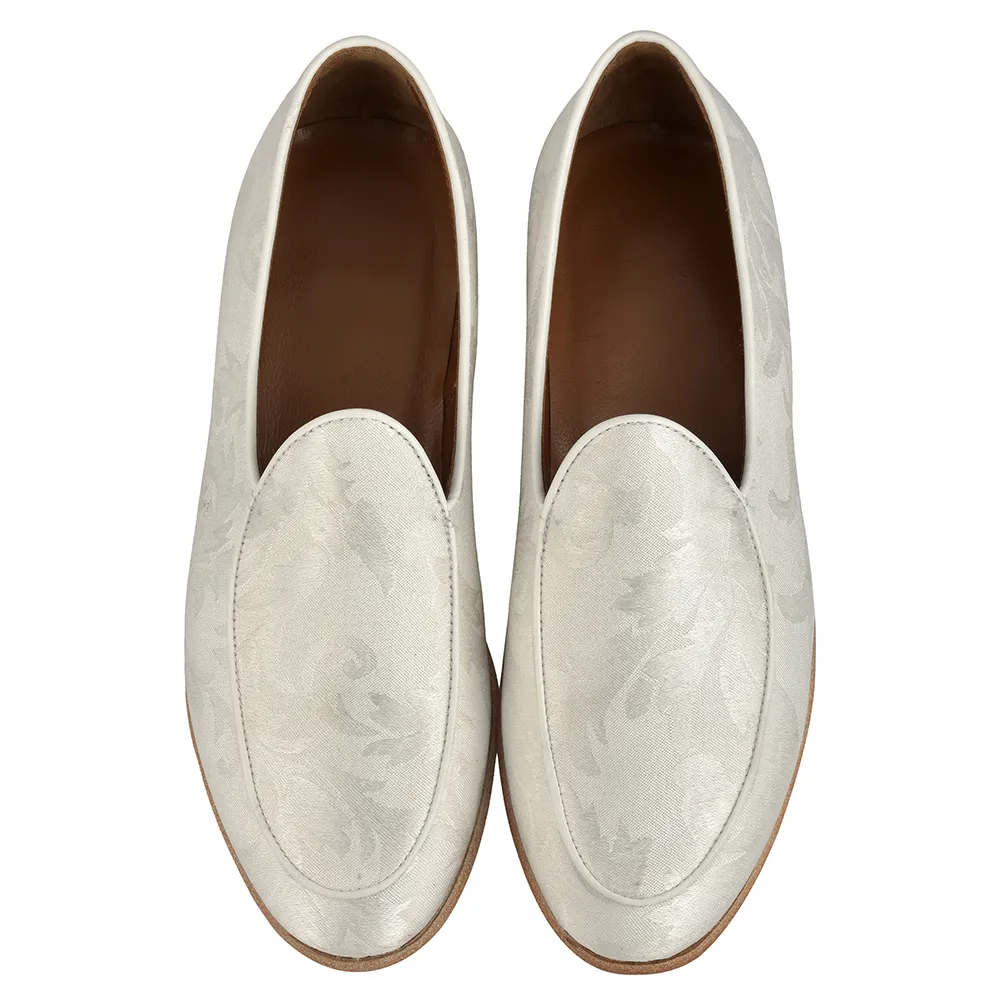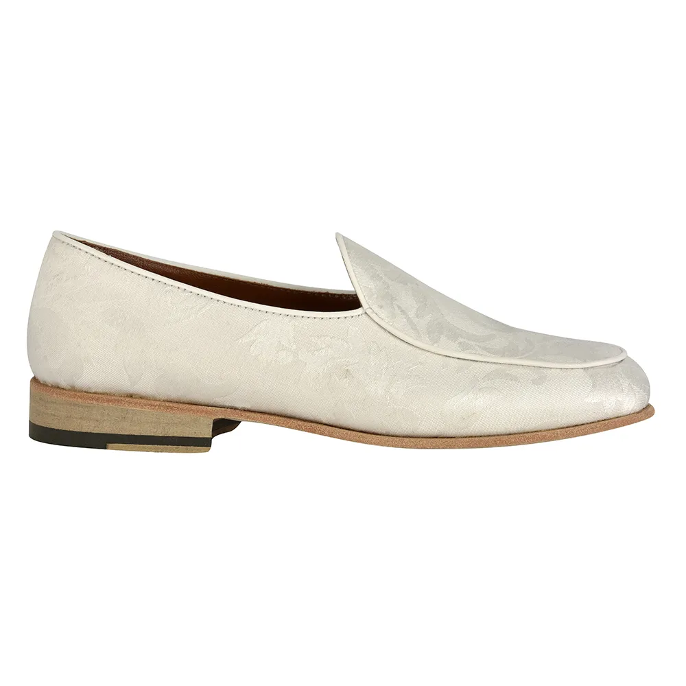La belgian loafer damasco art.8321 è un mocassino belgian loafer in tessuto damascato bianco con fiore a rilievo in contrasto