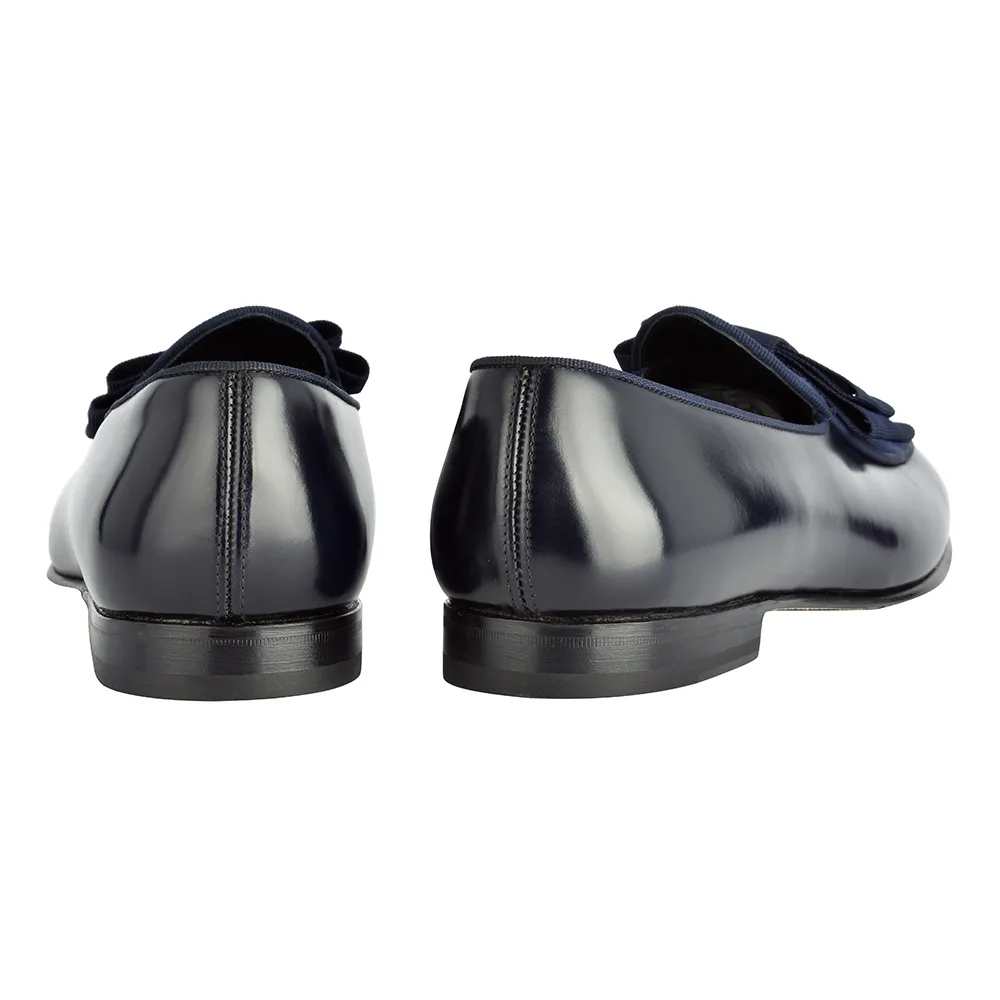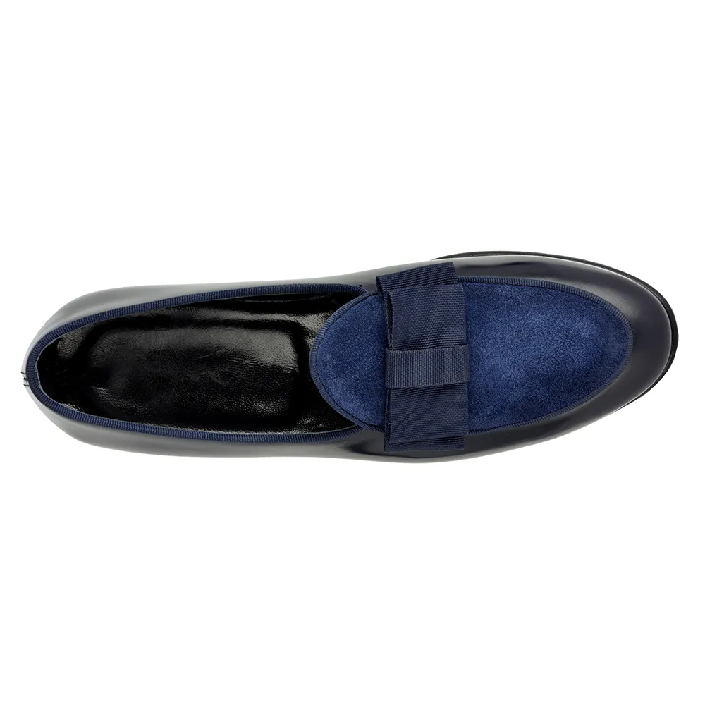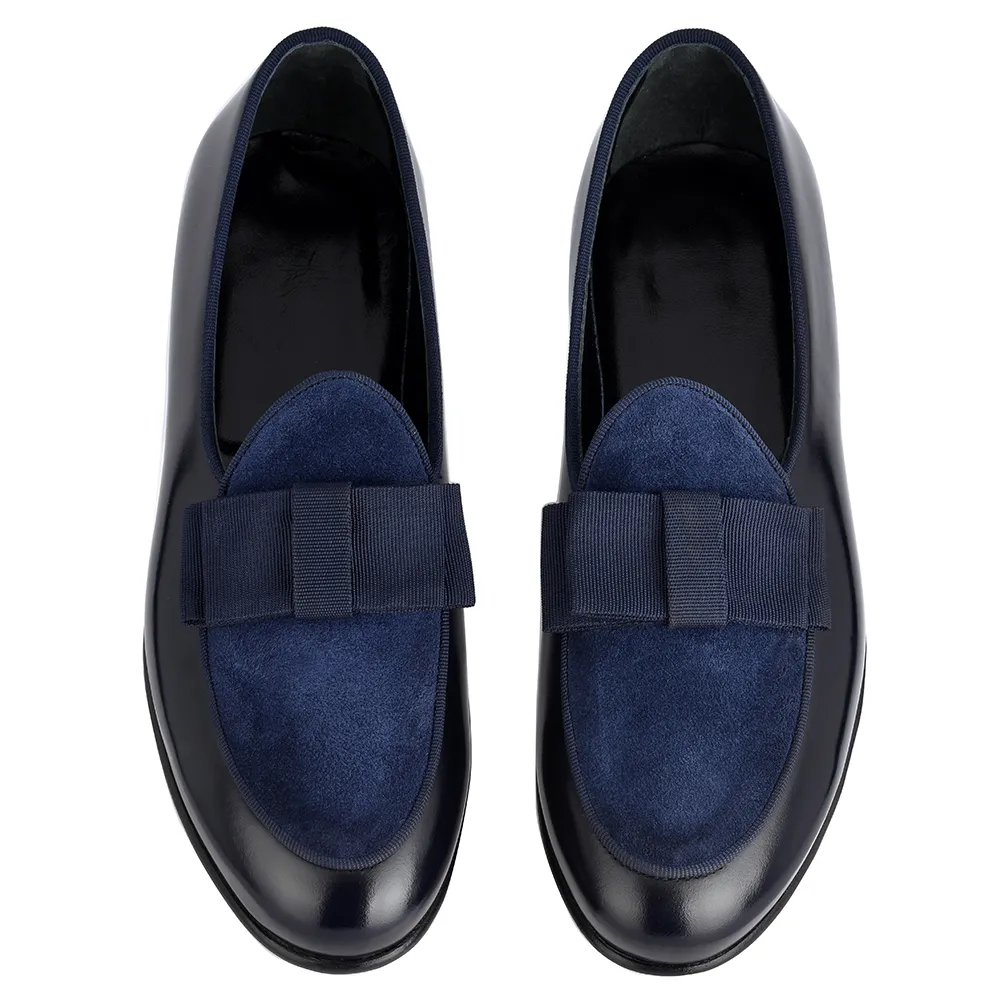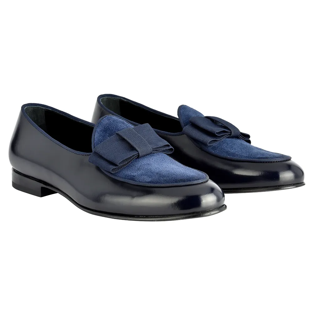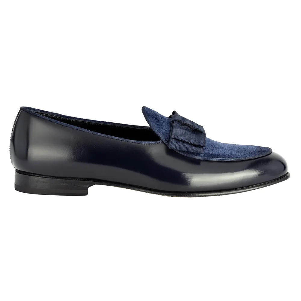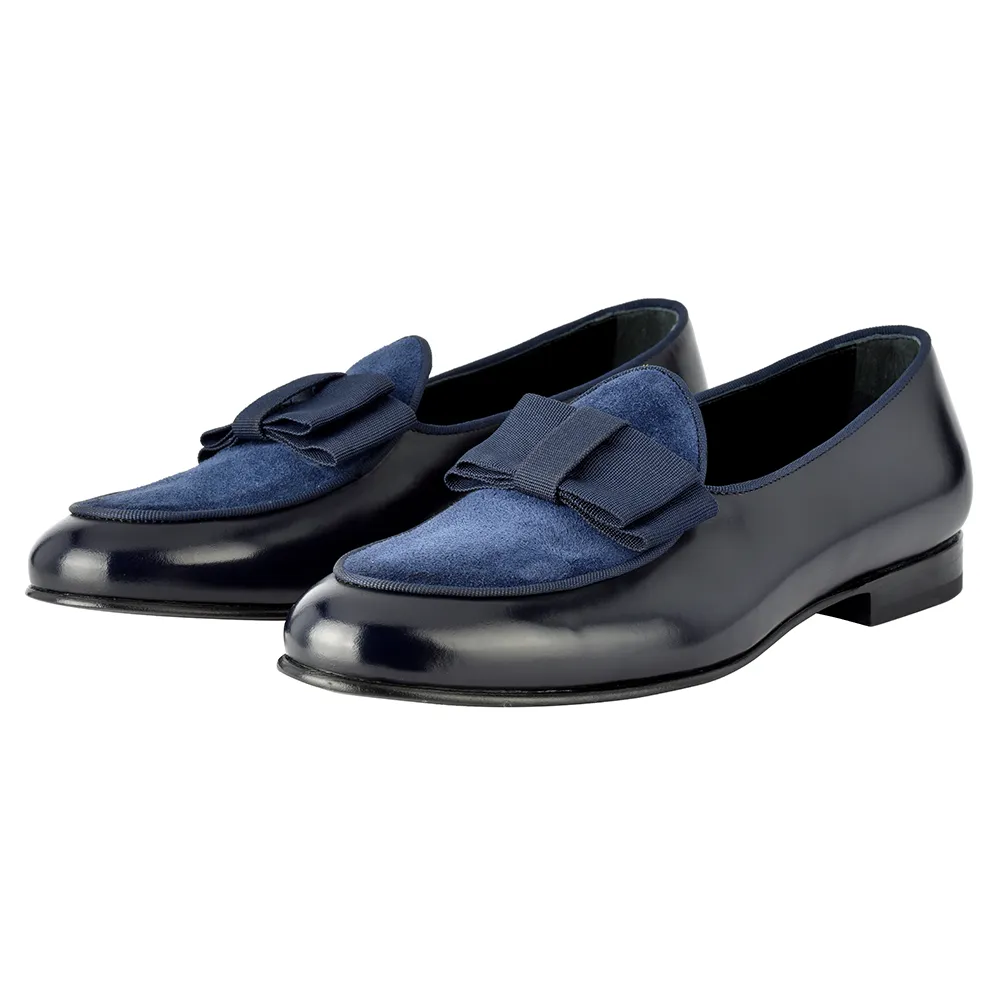 La belgian loafer gran blue – art.8509 è una belgian loafer pantofola mocassino in vitello abrasivato(polished)blu/nero e riporto in crosta blu con fiocco gros grain
