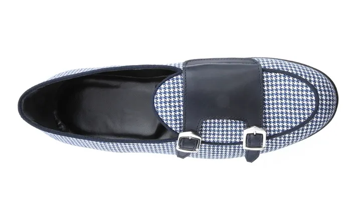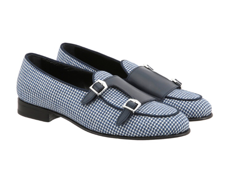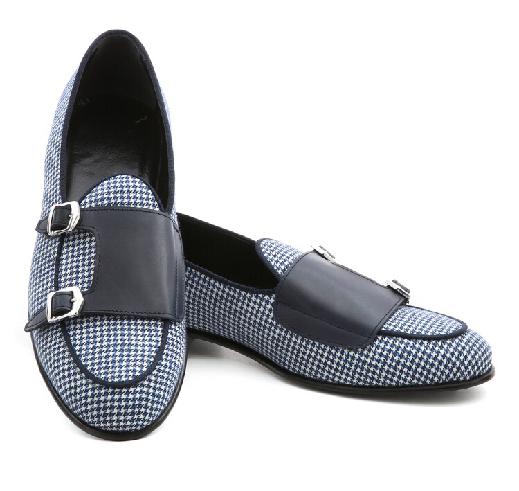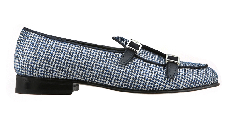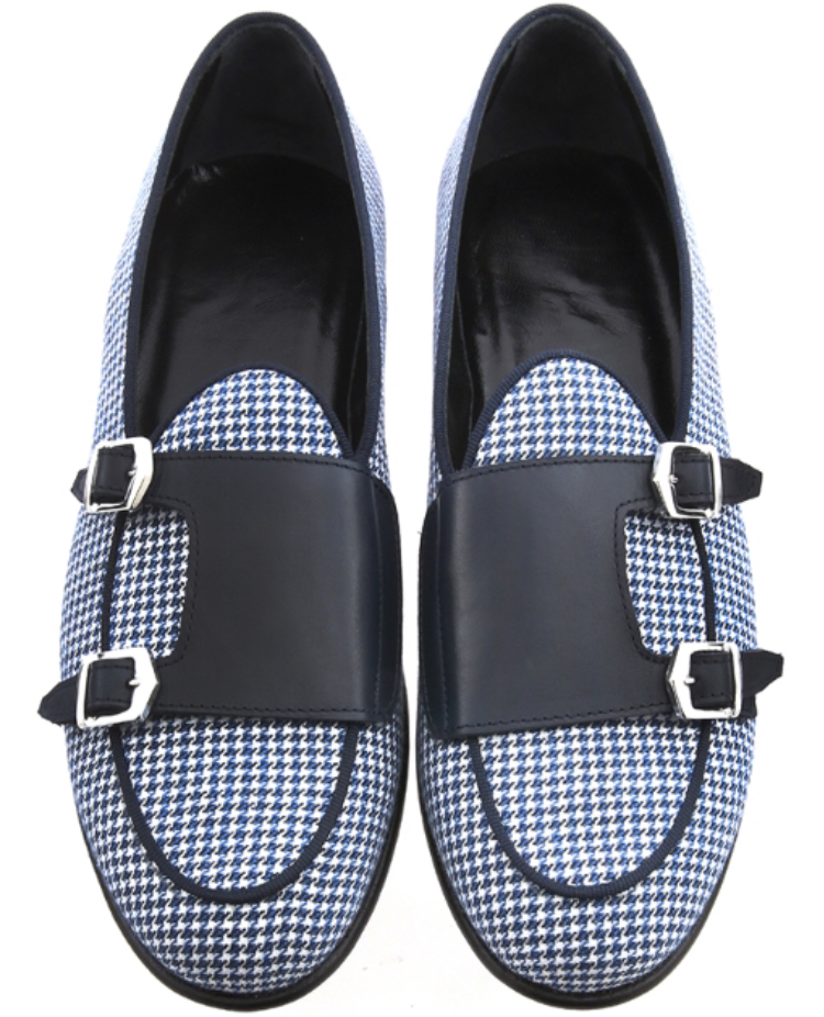 La belgian loafer Unique – art.8704 è un mocassino in tessuto pied de Poule Bianco/blu e riporto in vitello blu con rifiniture gros grain blue