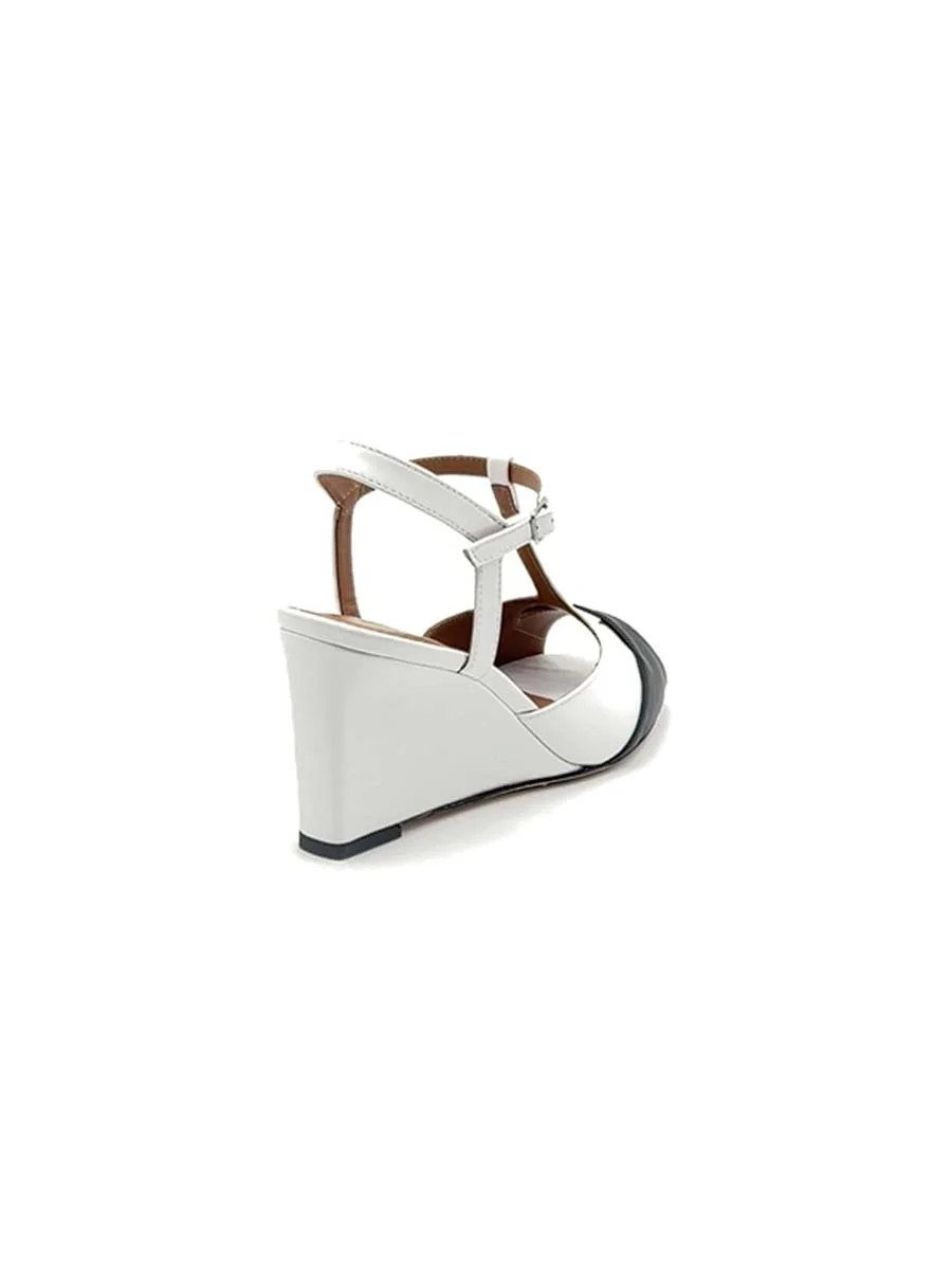 Si chiama “Bice” il nuovo modello di “Gianmarco Sorelli”, zeppa dalla forma a mandorla realizzata in morbida nappa bianca, con punta a contrasto in nappa nera. Tacco cm 7 il fondo è in cuoio, sottopiede in vera pelle.