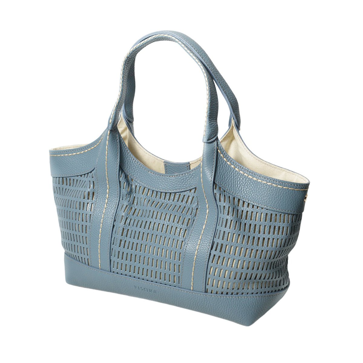 Borsa a mano Plinio Visonà modello Panama in pelle azzurra laserata. Interno in tessuto con chiusura a magnete per variarne l’apertura. Dimensioni 40 x 20 x 9 cm.