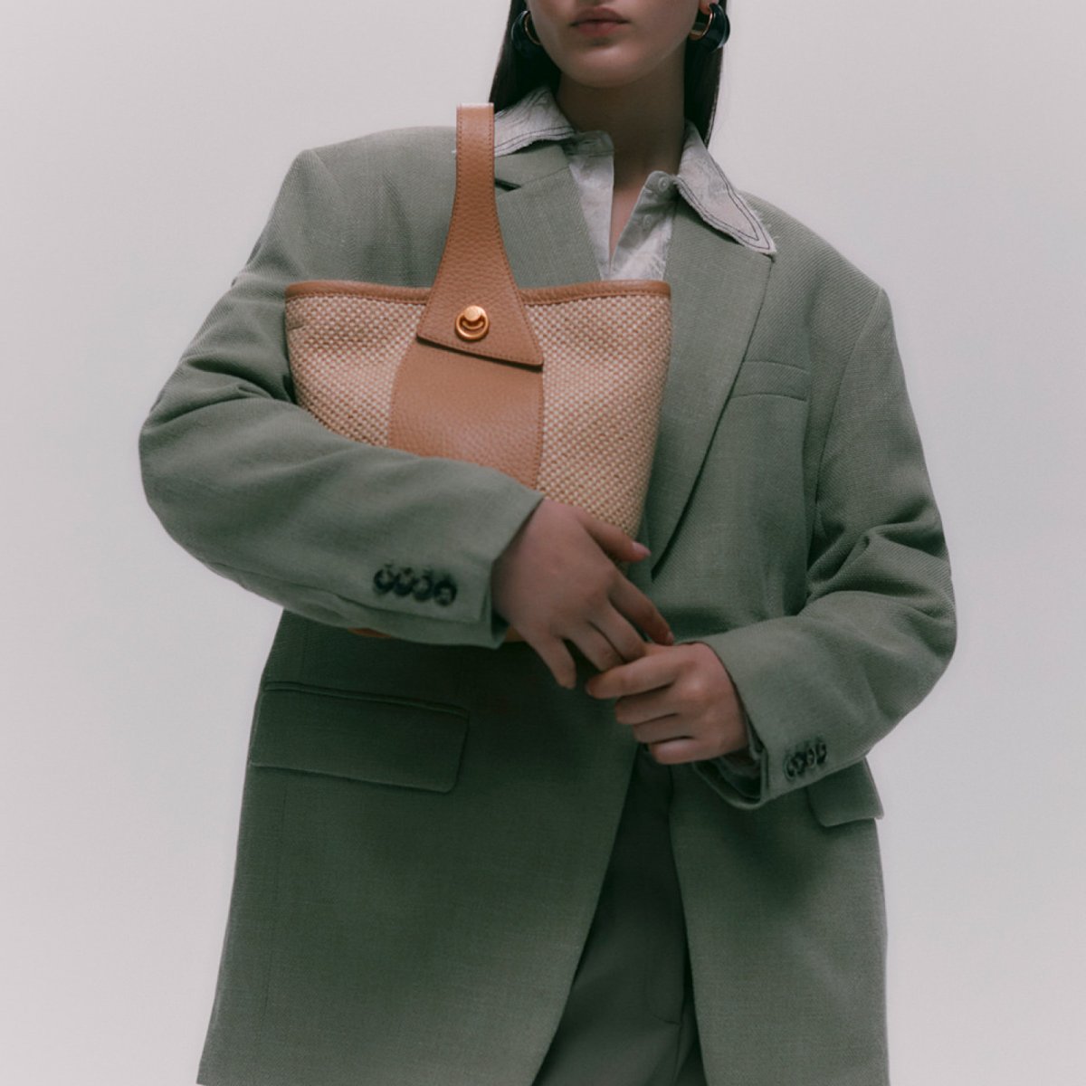 Borsa Gianni Chiarini a secchiello modello Ester in rafia color celeste con tracolla e profili in pelle cuoio. Dimensioni 18 x 23 x 18 cm.