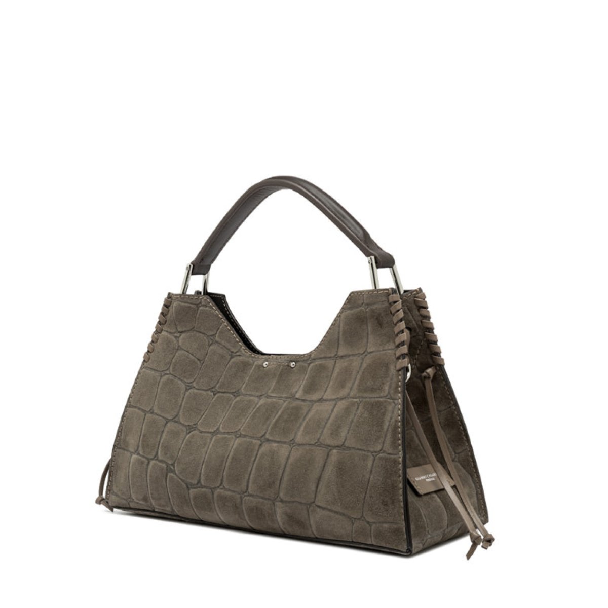 - Forma trapezoidale realizzata in pelle scamosciata a maxi stampa cocco color daino con dettagli in metallo.