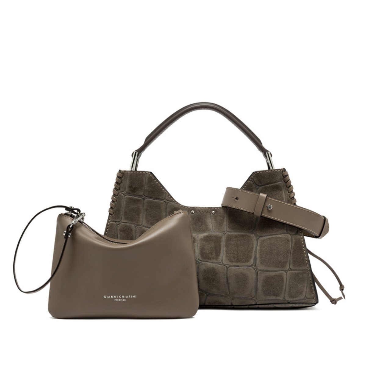 Borsa Gianni Chiarini modello Aurora. Forma trapezoidale realizzata in pelle scamosciata a maxi stampa cocco color daino con dettagli in metallo. Dotata di una comoda tracolla regolabile e chiusura superiore a magnete. Dimensioni 29 x 17 x 10 cm.