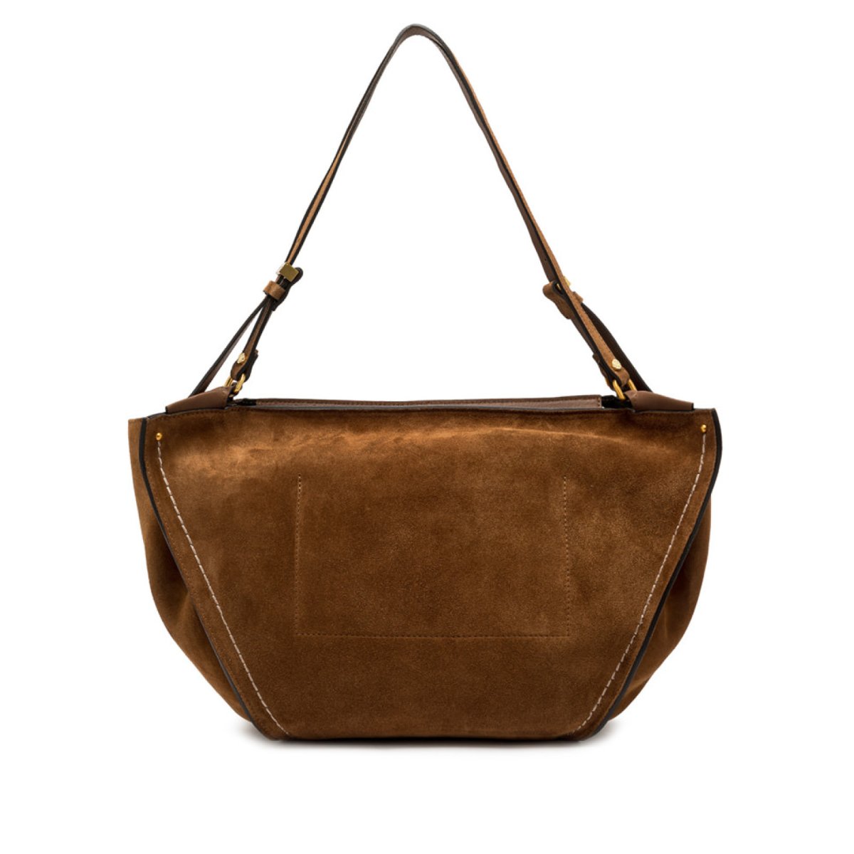 - Capiente e pratica è realizzata in pelle scamosciata cognac ed è impreziosita da una cucitura decorativa a contrasto.