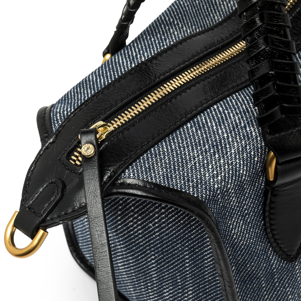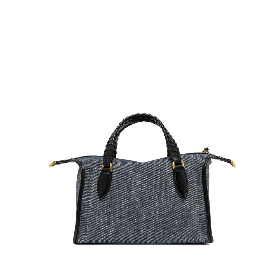 - Realizzata in tessuto effetto jeans ha manici in pelle e chiusura a zip.