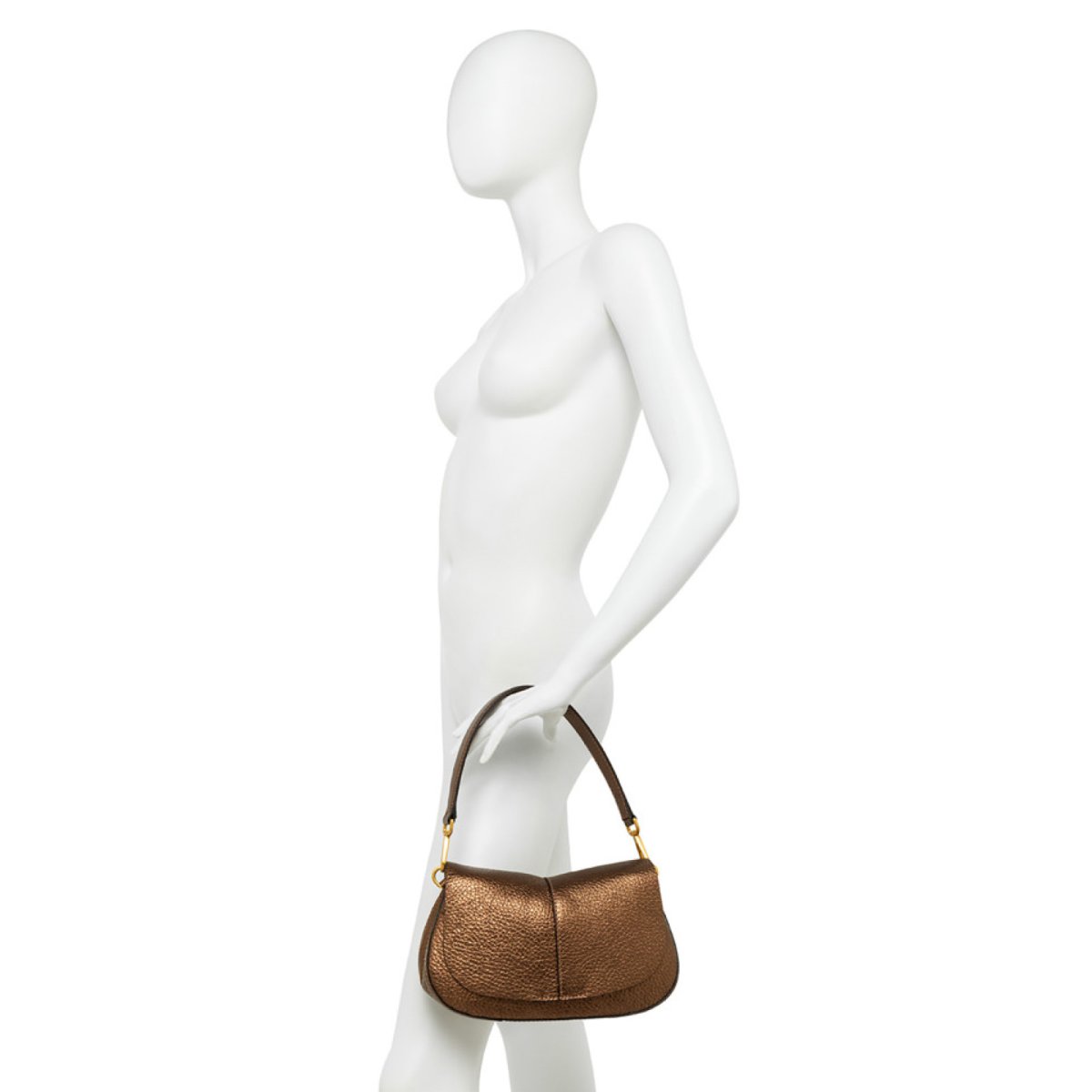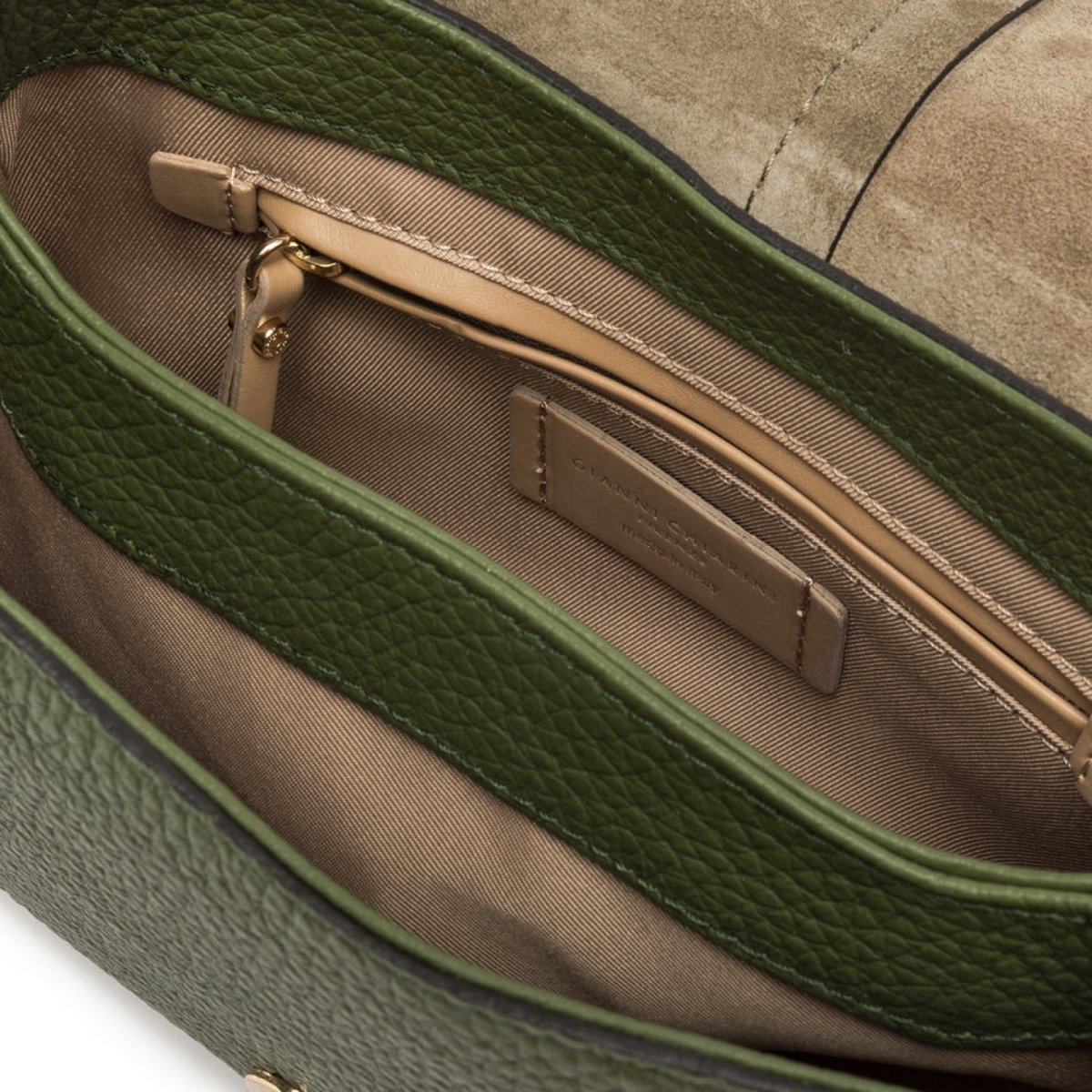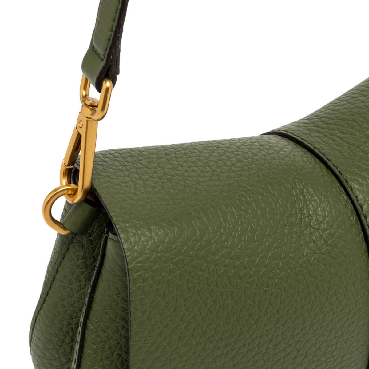 Borsa modello Helena Round modello iconico in pelle a grana maxi verde. Dotata di 2 tracolle: una in tessuto e una in pelle regolabili e rimovibili. Caratterizzata da un doppio compartimento interno con una tasca a scomparsa anche nella parte posteriore. Dimensioni 28 x 16 x 7,5 cm.