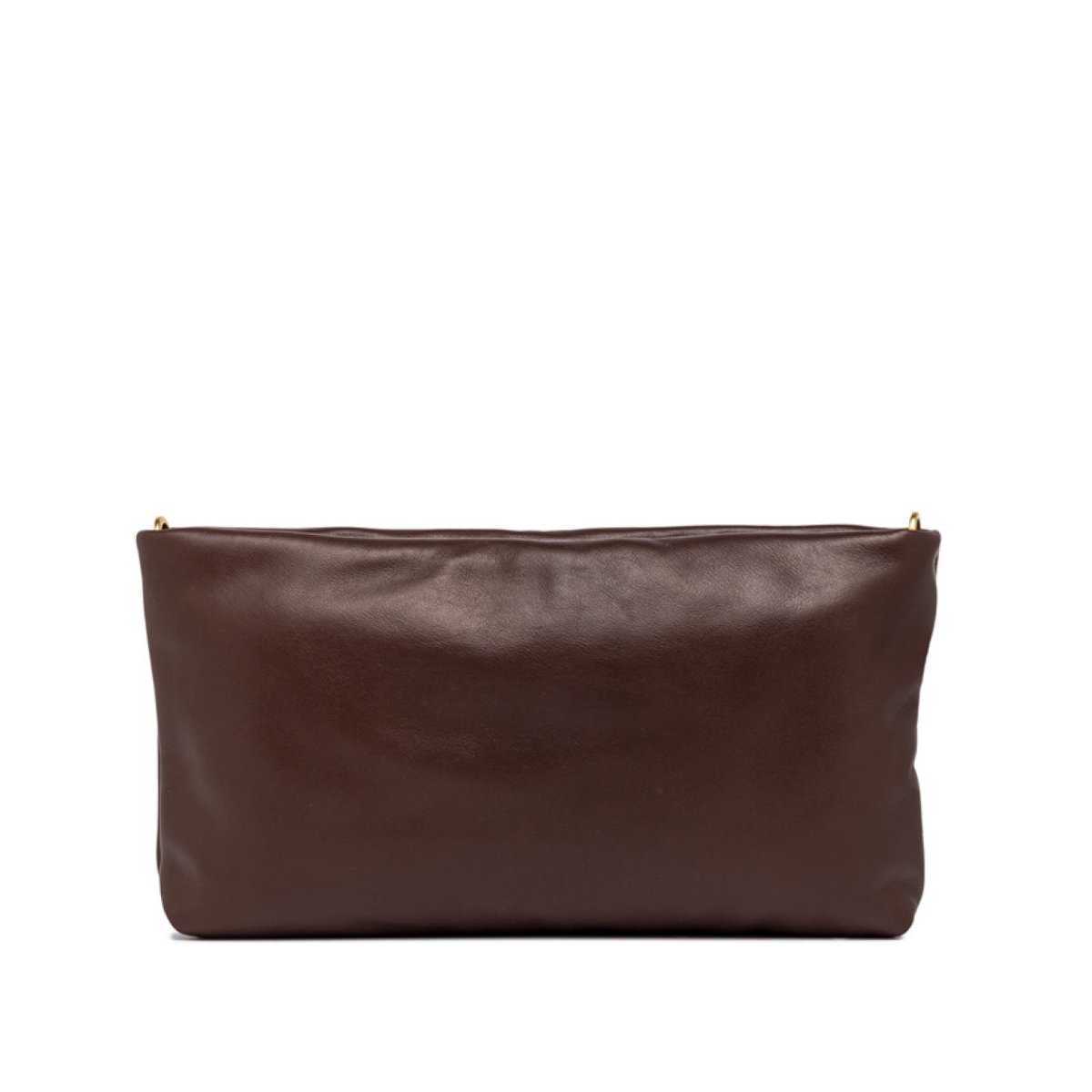 - Forma rettangolare in nappa moro con tracolla intrecciata in tessuto.