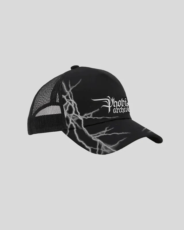 NUOVI ARRIVI PHOBIA PHA006 Cappello trucker nero con visiera curva e stampa serigrafica fulmini laterali in diversi colori. Questo cappello è un accessorio perfetto da indossare in ogni momento della tua giornata per dare quel tocco in più di personalità e grinta al tuo stile.