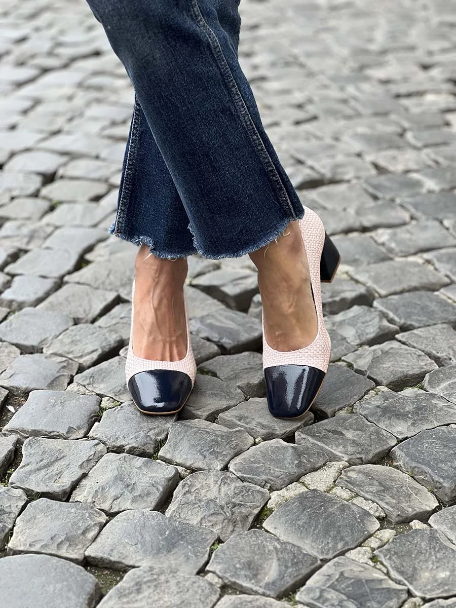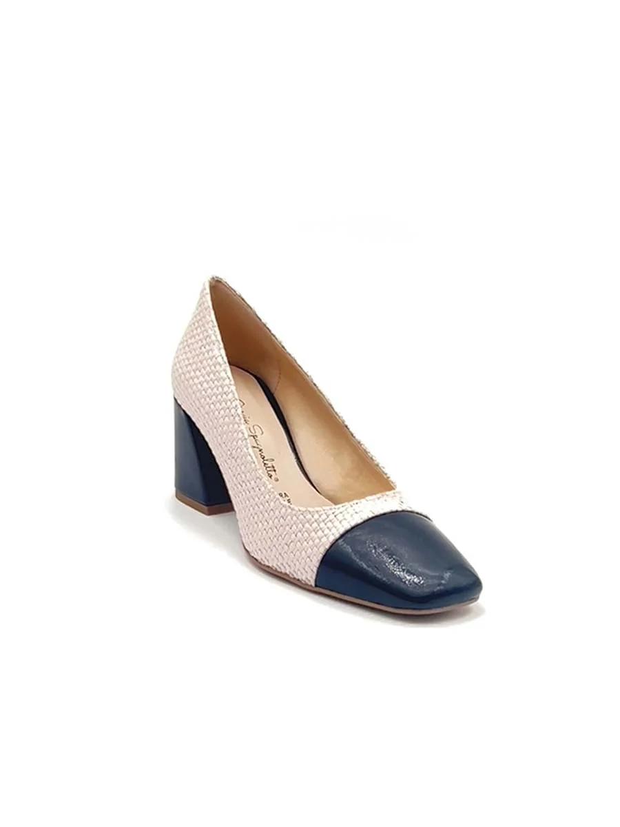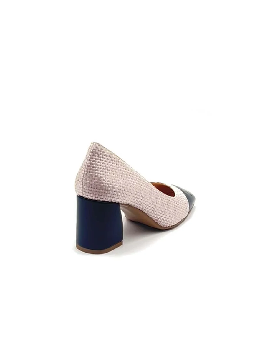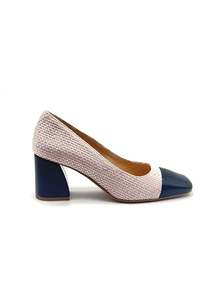 Si chiama “Carla” la nuova Decollete di questa stagione, dalla forma squadrata, realizzata in rafia cipria con punta e tacco a contrasto in vernice blu navy. Tacco largo cm 6, sottopiede in vera pelle e fondo in cuoio.