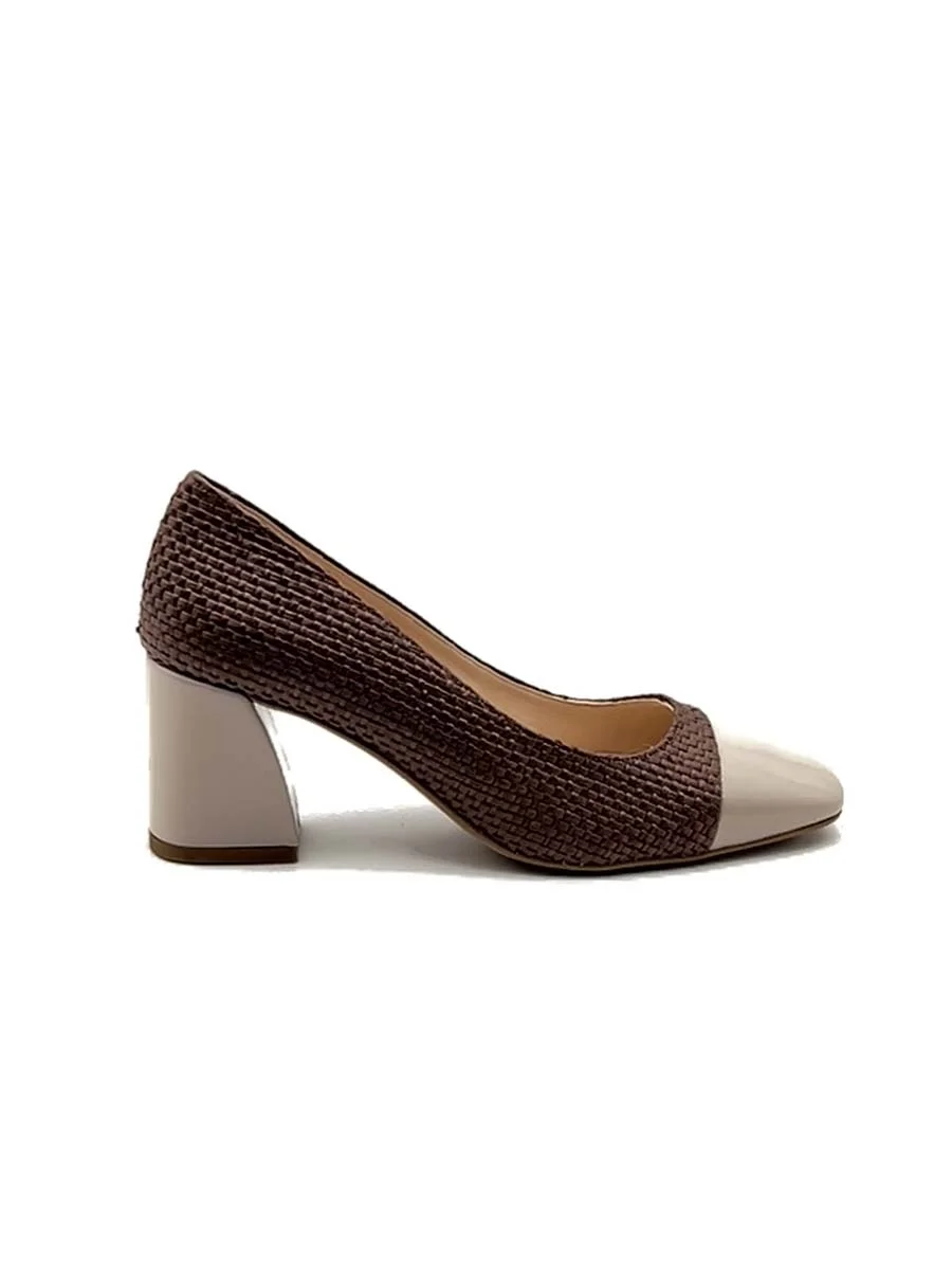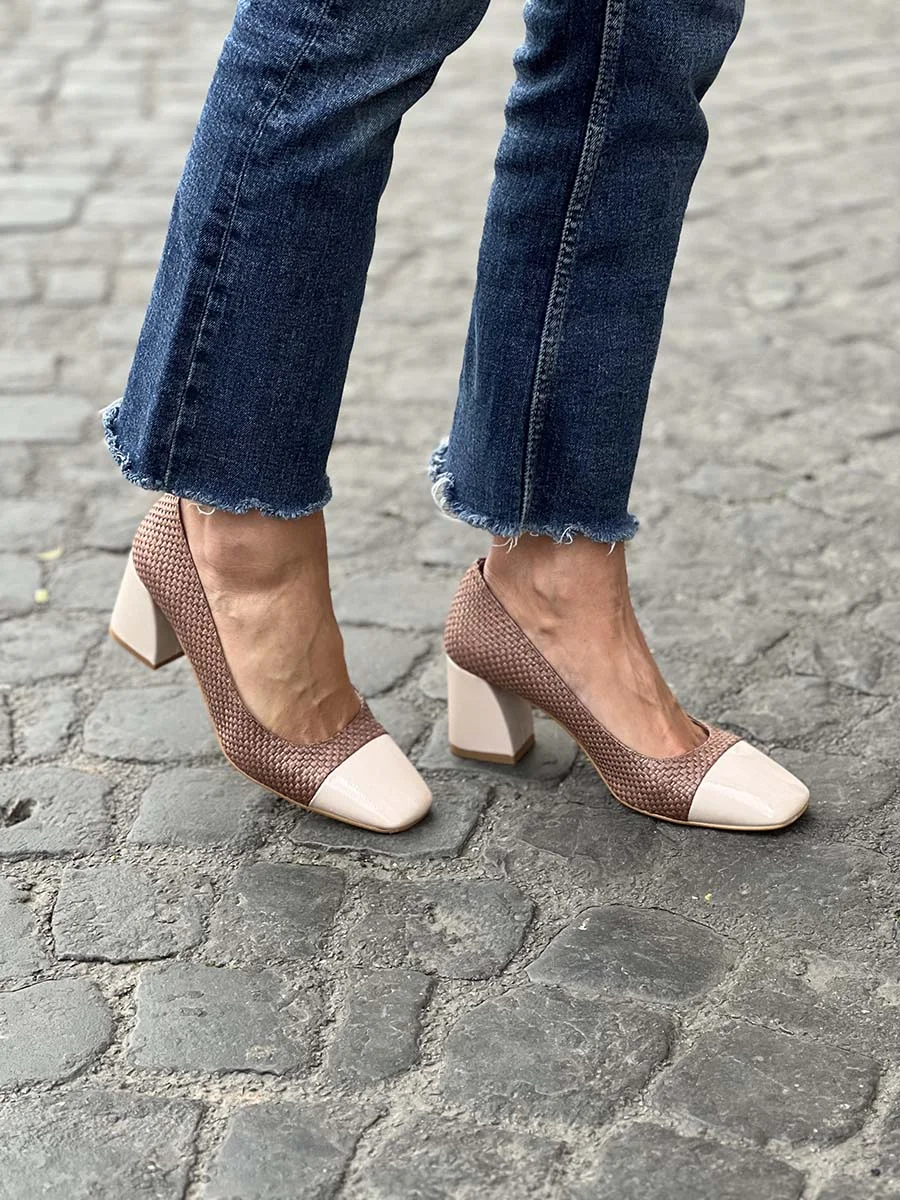 Si chiama “Carla” la nuova Decollete di questa stagione, dalla forma squadrata, realizzata in rafia marrone con punta e tacco a contrasto in vernice nude. Tacco largo cm 6, sottopiede in vera pelle e fondo in cuoio.