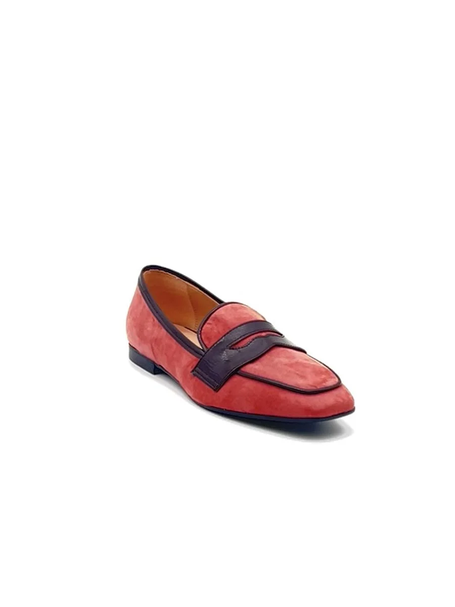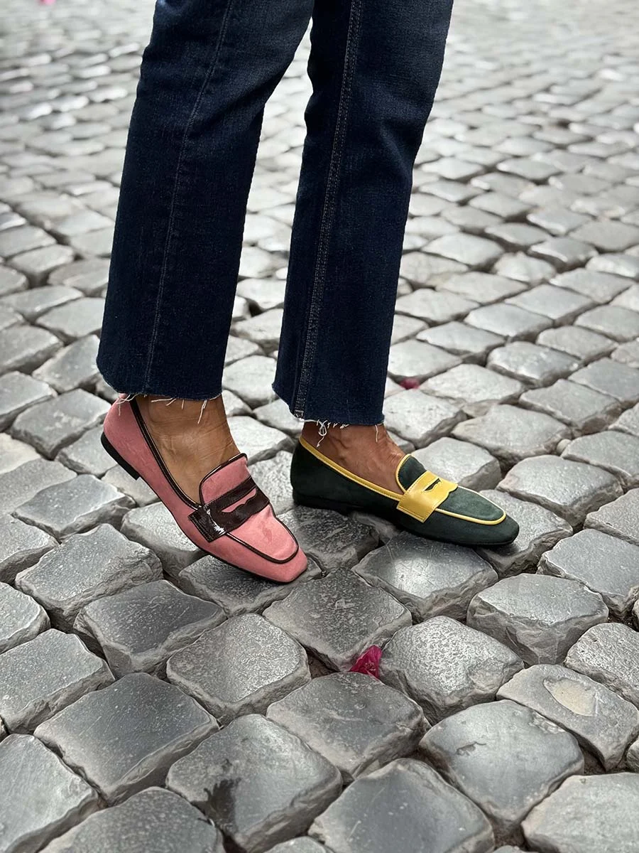 Si chiama “Caterina” il nuovo mocassino di questa stagione, dalla forma squadrata, realizzato in morbido camoscio rosa, con profili a contrasto in vernice testa di moro. Tacco cm 1, il fondo è in gomma.
