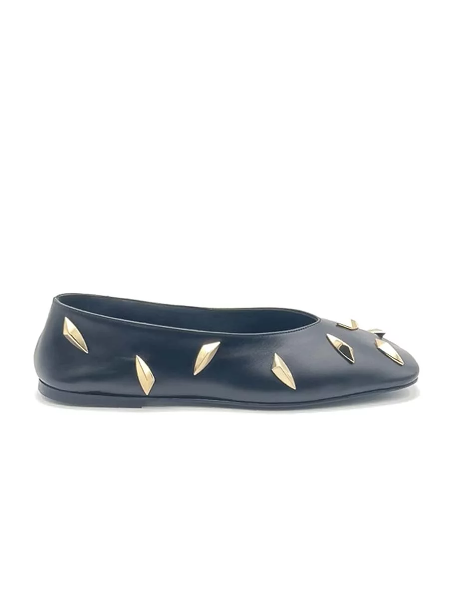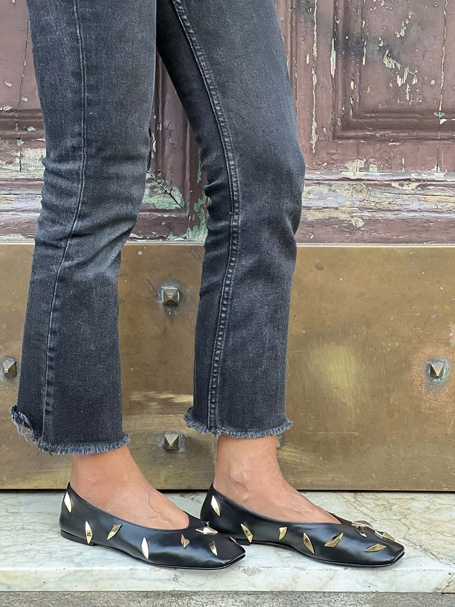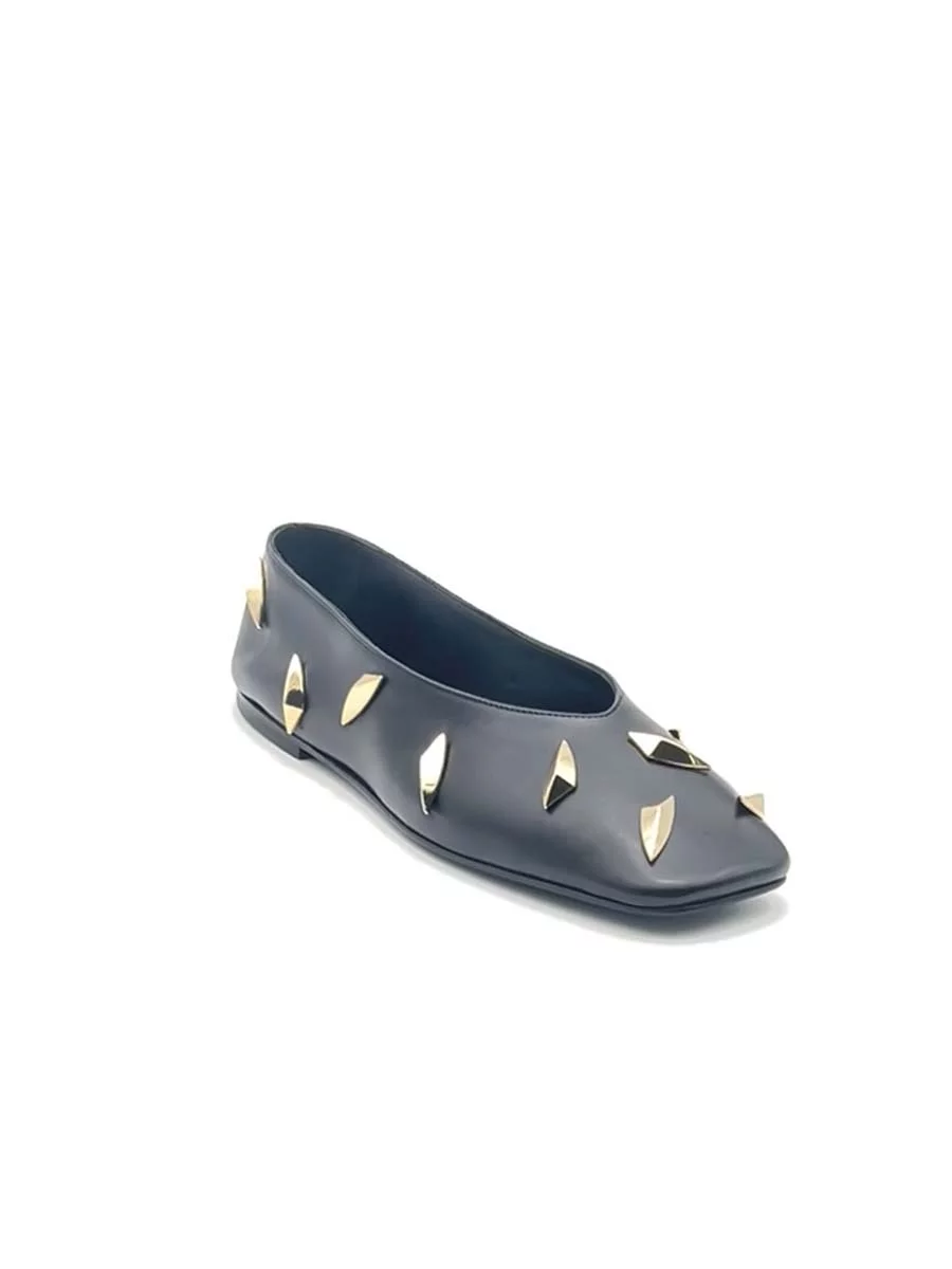 Si chiama “Céline” la nuova ballerina di questa stagione, dalla forma squadrata, realizzata in morbida nappa nera con applicazioni in oro cromato. Tacco cm 1.