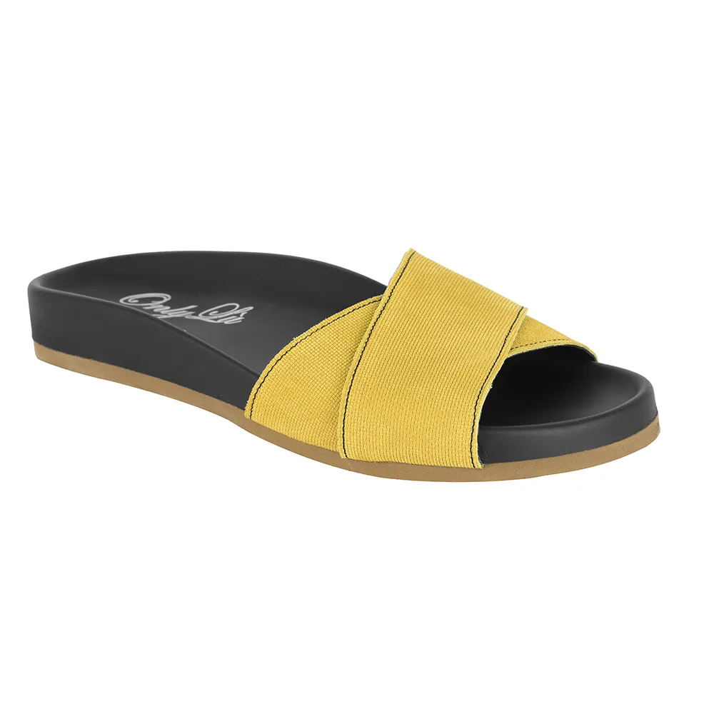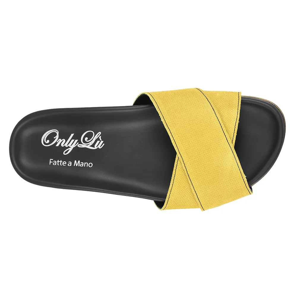 La ciabatta donna incrociata Citrus art.6313 è una ciabatta in camoscio giallo acido con plantare interamente in pelle di vitello color nero e con suola per il contatto a terra in microporosa color camel.