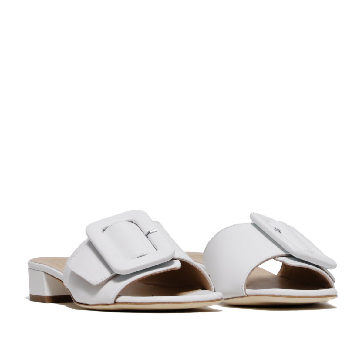 Ciabattina a fascione in pelle bianca e grande fibbia. Suola in cuoio tacco cm 3. Calzata regolare.