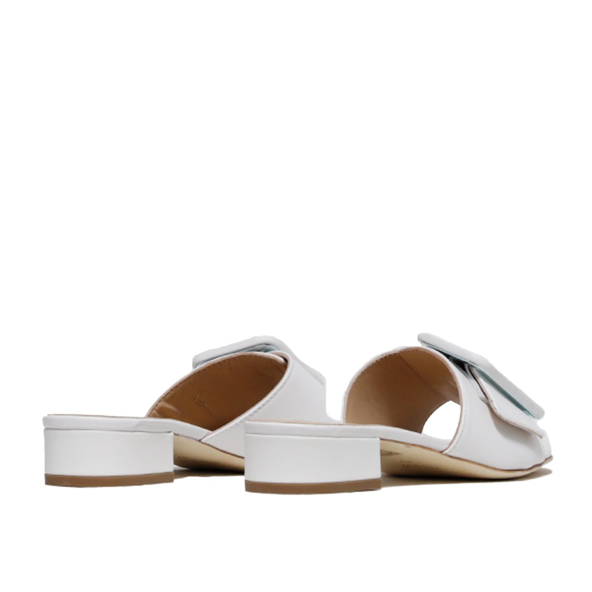 - Ciabattina a fascione in pelle bianca e grande fibbia.