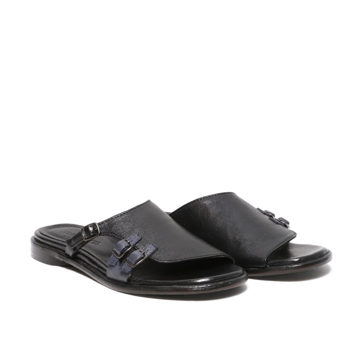 Ciabattina in pelle nera con due fibbiette e cinghietti blu. Suola in cuoio. Tacco di cm 1. Calzata regolare.