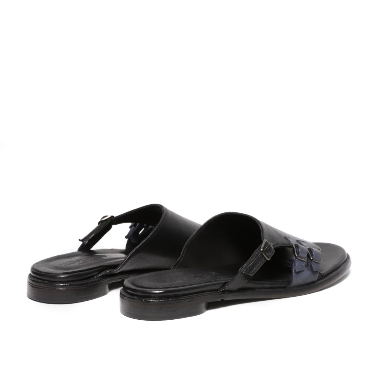 Ciabattina in pelle nera con due fibbiette e cinghietti blu.