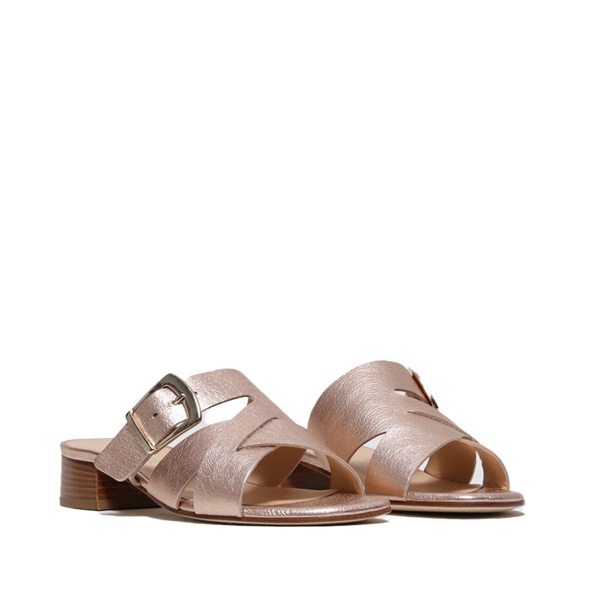 - Ciabattina in pelle rame con incrocio e fibbia dorata.