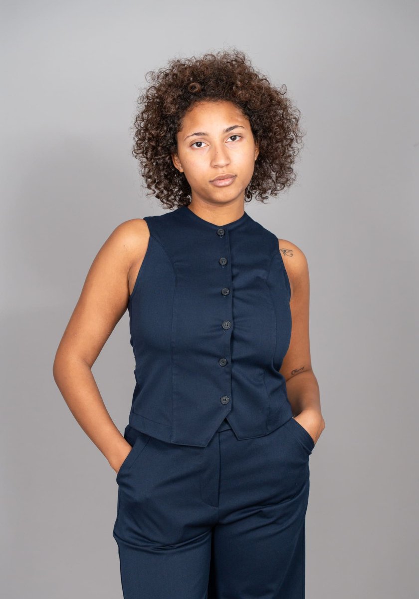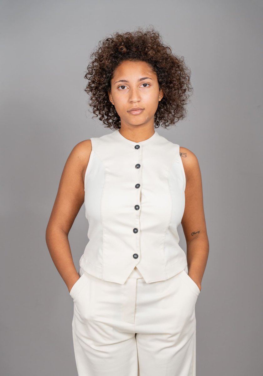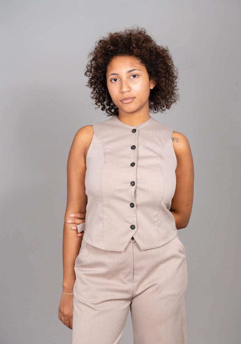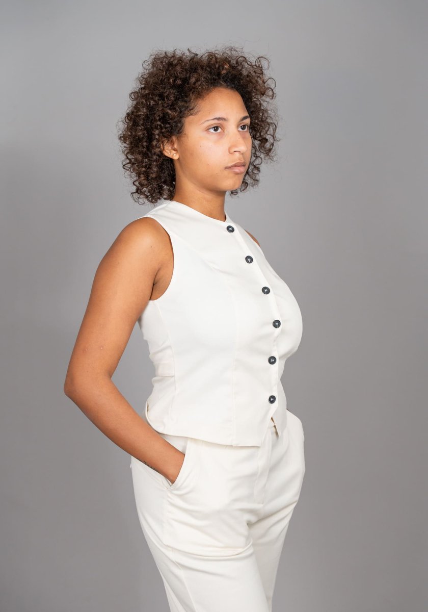 Equilibrio perfetto tra struttura e femminilità, il Corsetto Otto reinterpreta con eleganza moderna il classico gilet sartoriale. La sua linea slim scolpisce delicatamente la figura, valorizzando il punto vita grazie al cordino regolabile sul retro, che permette di adattare la vestibilità con naturalezza.