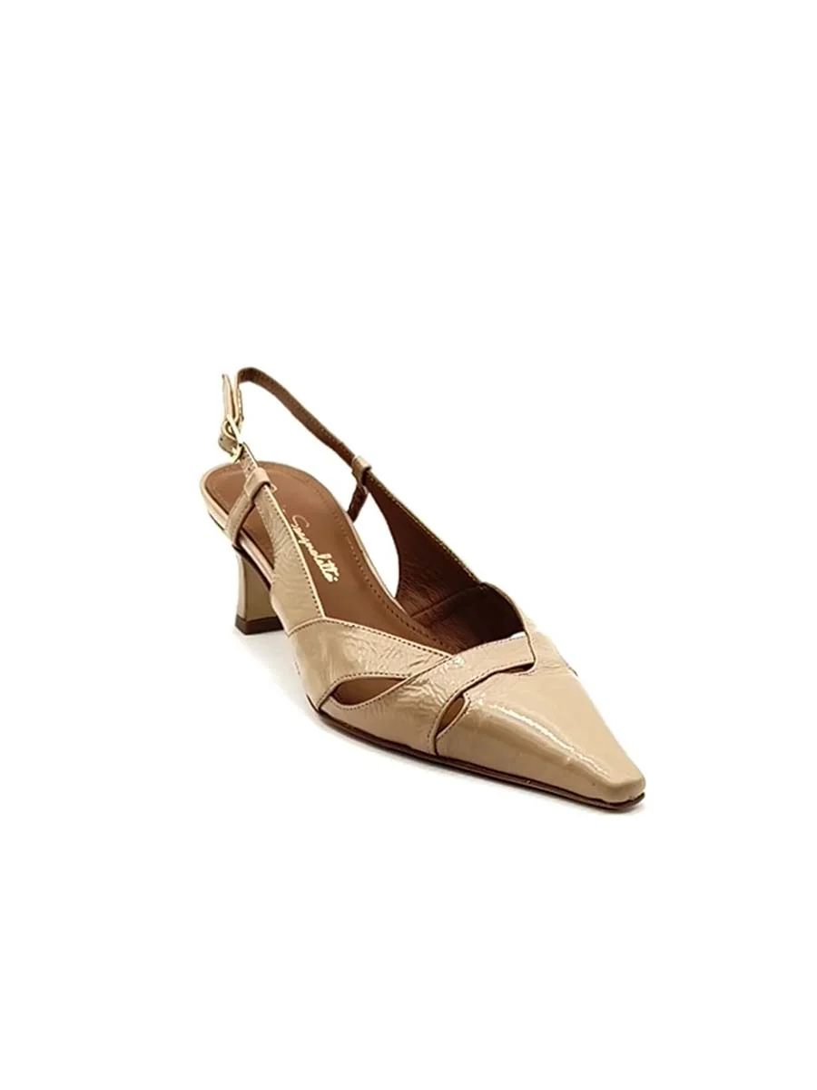 Si chiama “Elena” la nuova Slingback di questa stagione, dalla forma a punta, realizzata in morbida vernice beige con cinturino regolabile alla caviglia. Tacco cm 5. Il fondo è in cuoio.