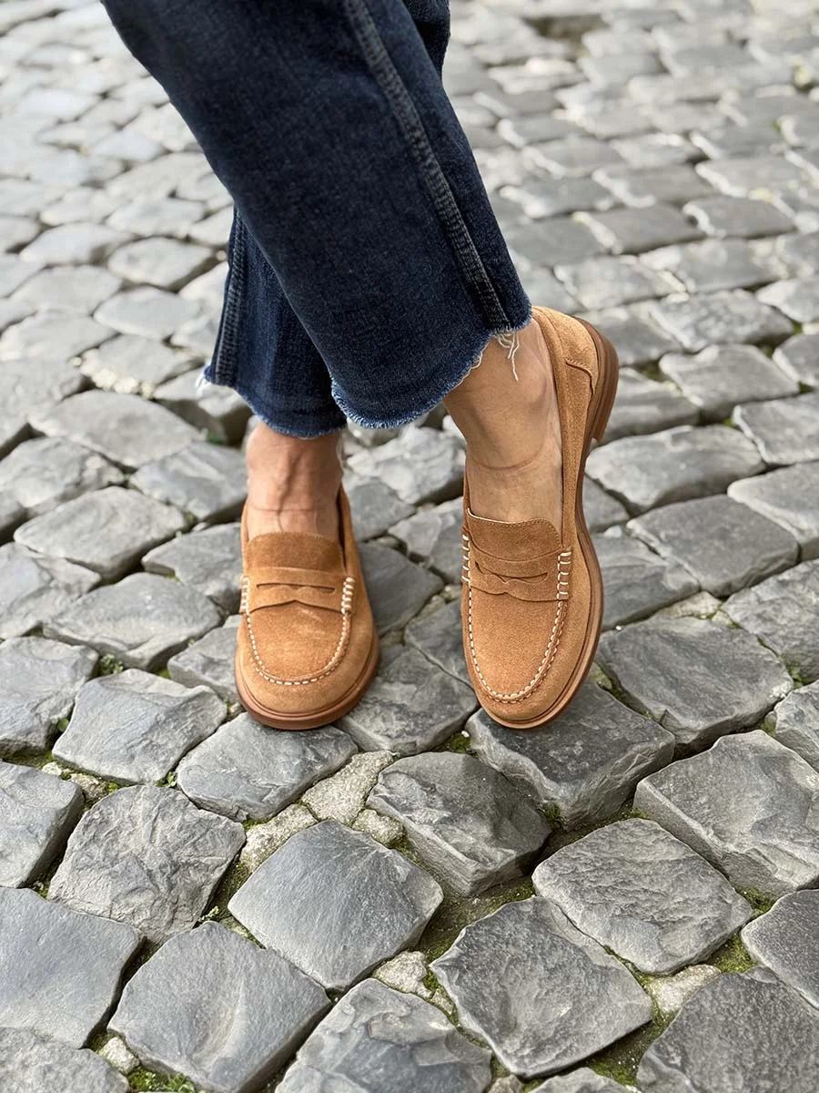 Si chiama “Elsa” il nuovo mocassino “Penny Loafer” di questa stagione. Dalla forma tonda realizzato in morbido camoscio cuoio con cuciture fatto a mano di lavorazione artigianale e fessura a forma di diamante. Un mocassino quattro stagioni con tomaia in pelle sfoderata e fondo in cuoio, tacco cm 2.