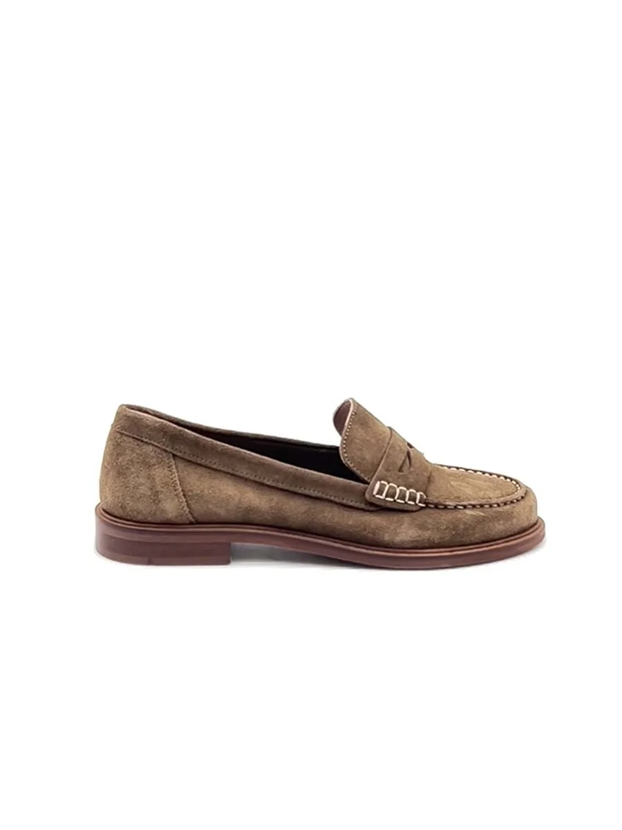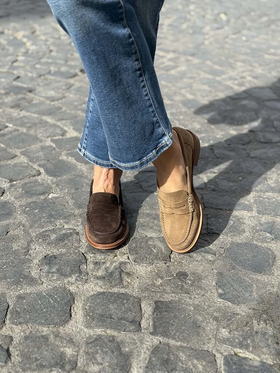 Si chiama “Elsa” il nuovo mocassino “Penny Loafer” di questa stagione. Dalla forma tonda realizzato in morbido camoscio fango con cuciture fatto a mano di lavorazione artigianale e fessura a forma di diamante. Un mocassino quattro stagioni con tomaia in pelle sfoderata e fondo in cuoio, tacco cm 2.