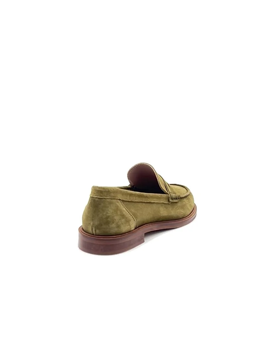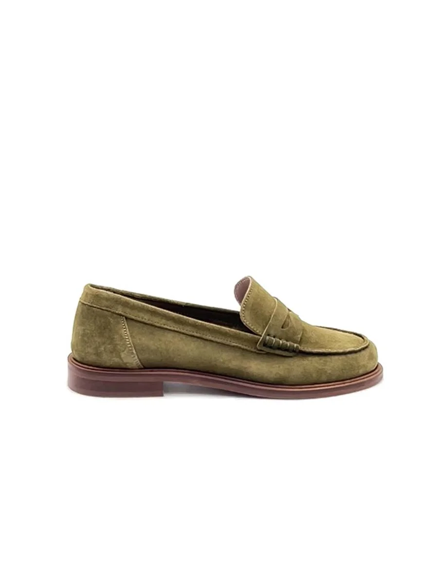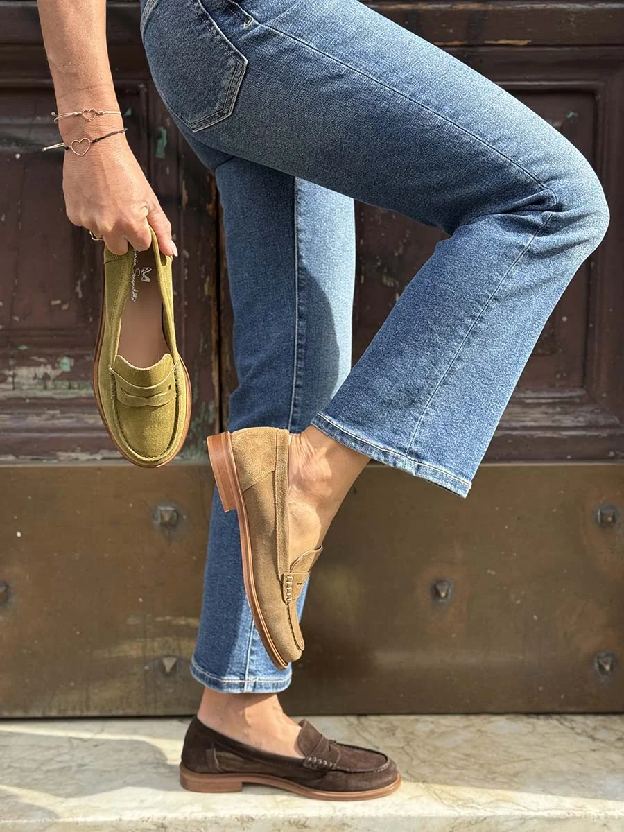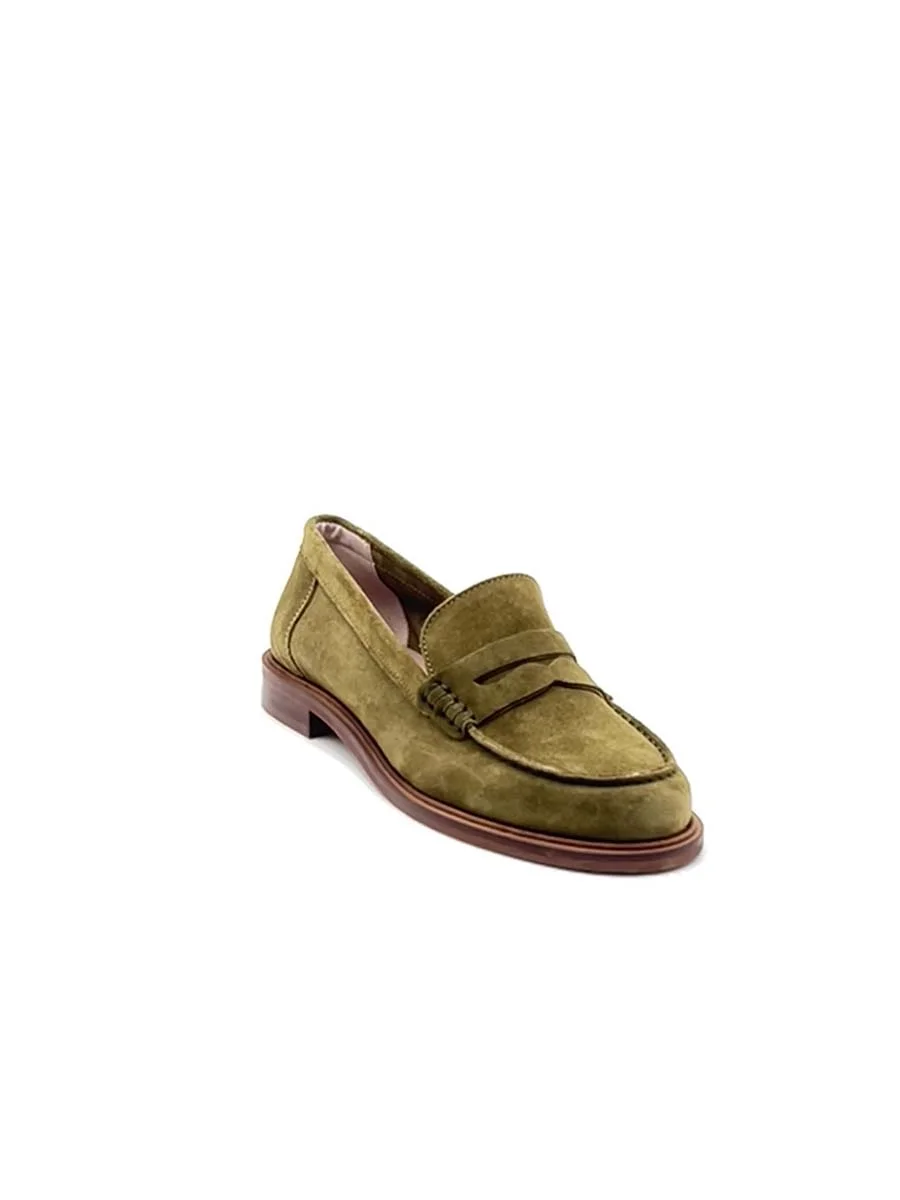 Si chiama “Elsa” il nuovo mocassino “Penny Loafer” di questa stagione. Dalla forma tonda realizzato in morbido camoscio verde con cuciture fatto a mano di lavorazione artigianale e fessura a forma di diamante. Un mocassino quattro stagioni con tomaia in pelle sfoderata e fondo in cuoio, tacco cm 2.
