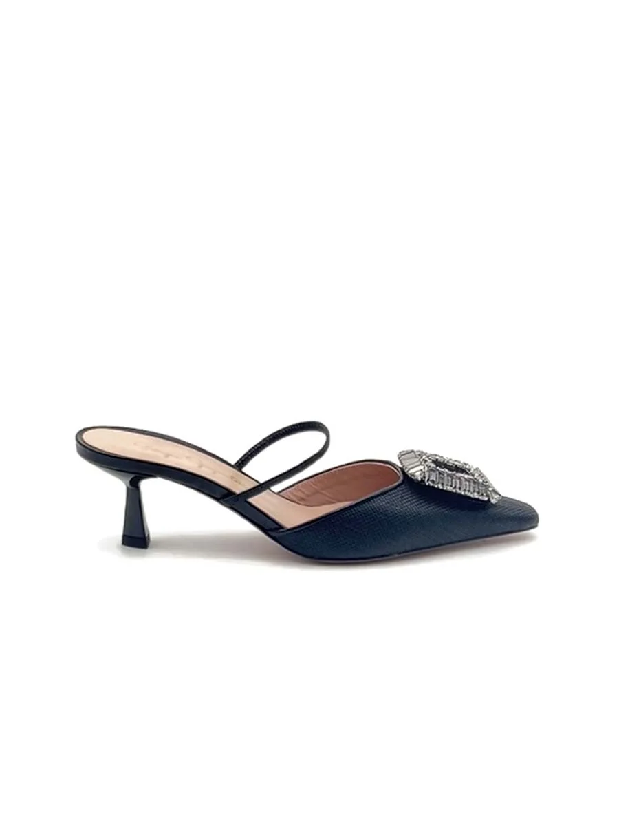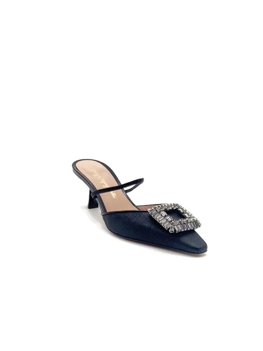 Si chiama “Emilias” il nuovo Sabot di questa stagione, dalla forma a punta, tomaia realizzata in rafia nera, con profili e cinturino in nappa tono su tono e accessorio in “Swarovski”. Tacco cm 5. Il fondo è in cuoio.