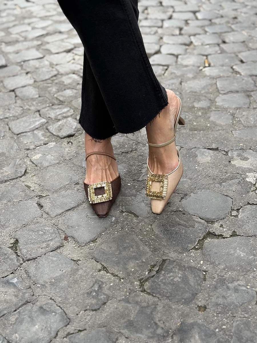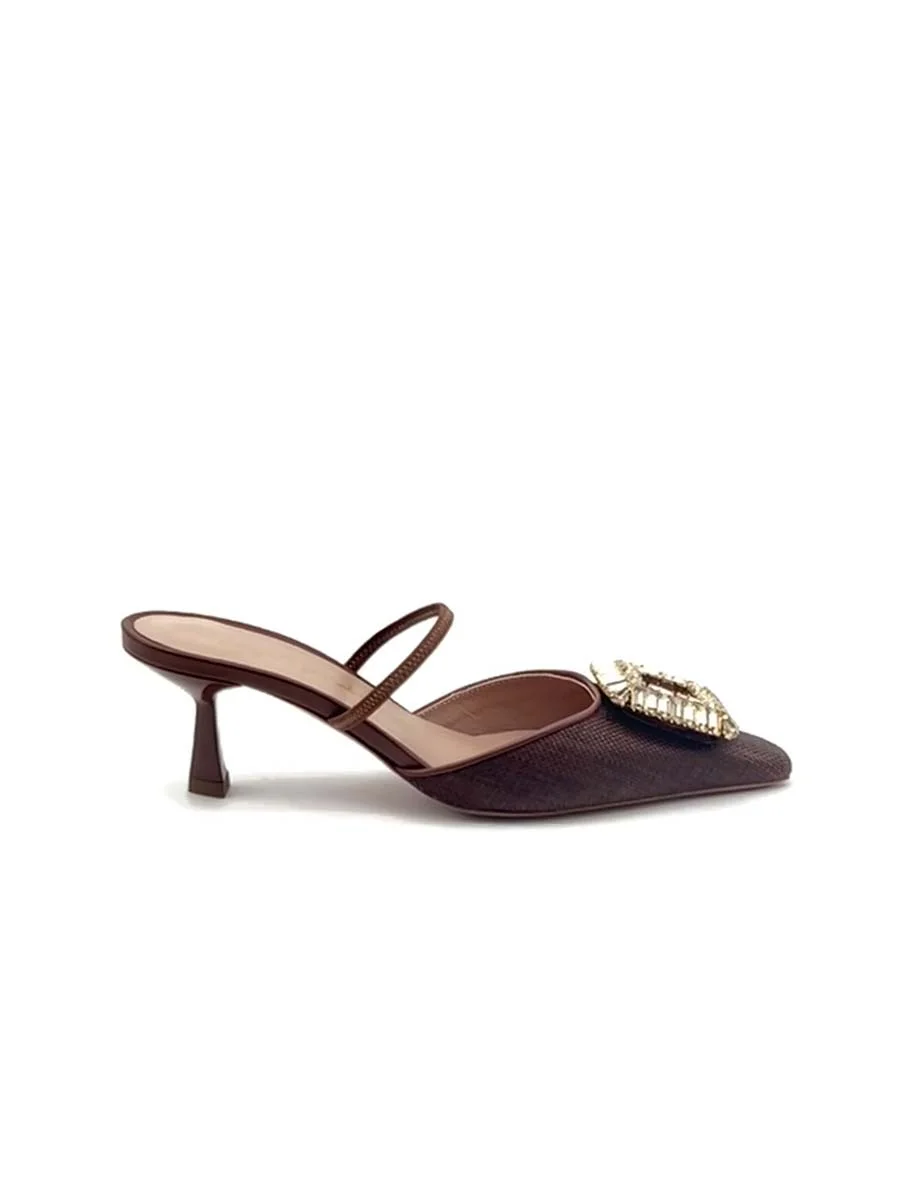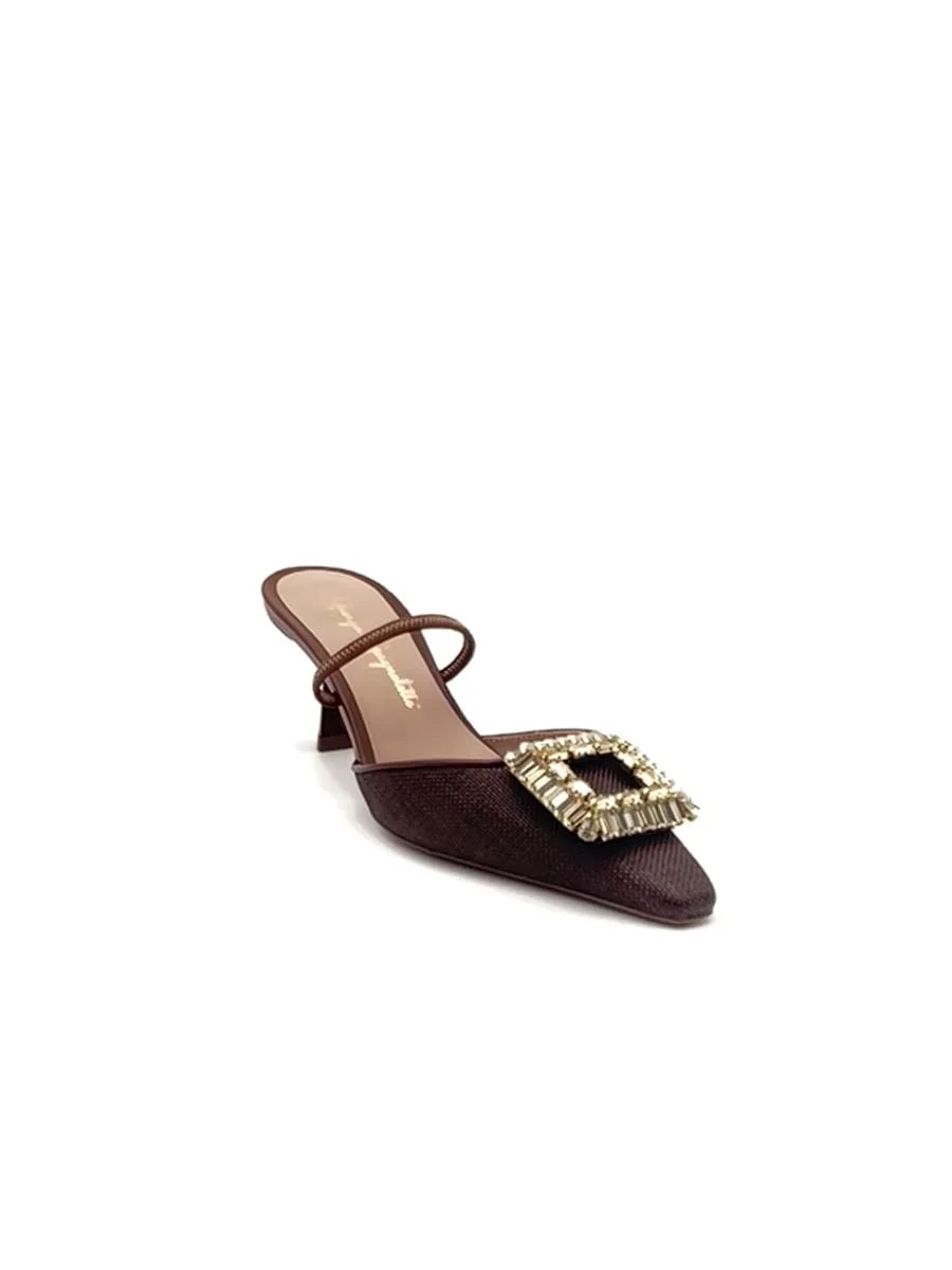 Si chiama “Emilias” il nuovo Sabot di questa stagione, dalla forma a punta, tomaia realizzata in rafia testa di moro, con profili e cinturino in nappa tono su tono e accessorio in “Swarovski”. Tacco cm 5. Il fondo è in cuoio.