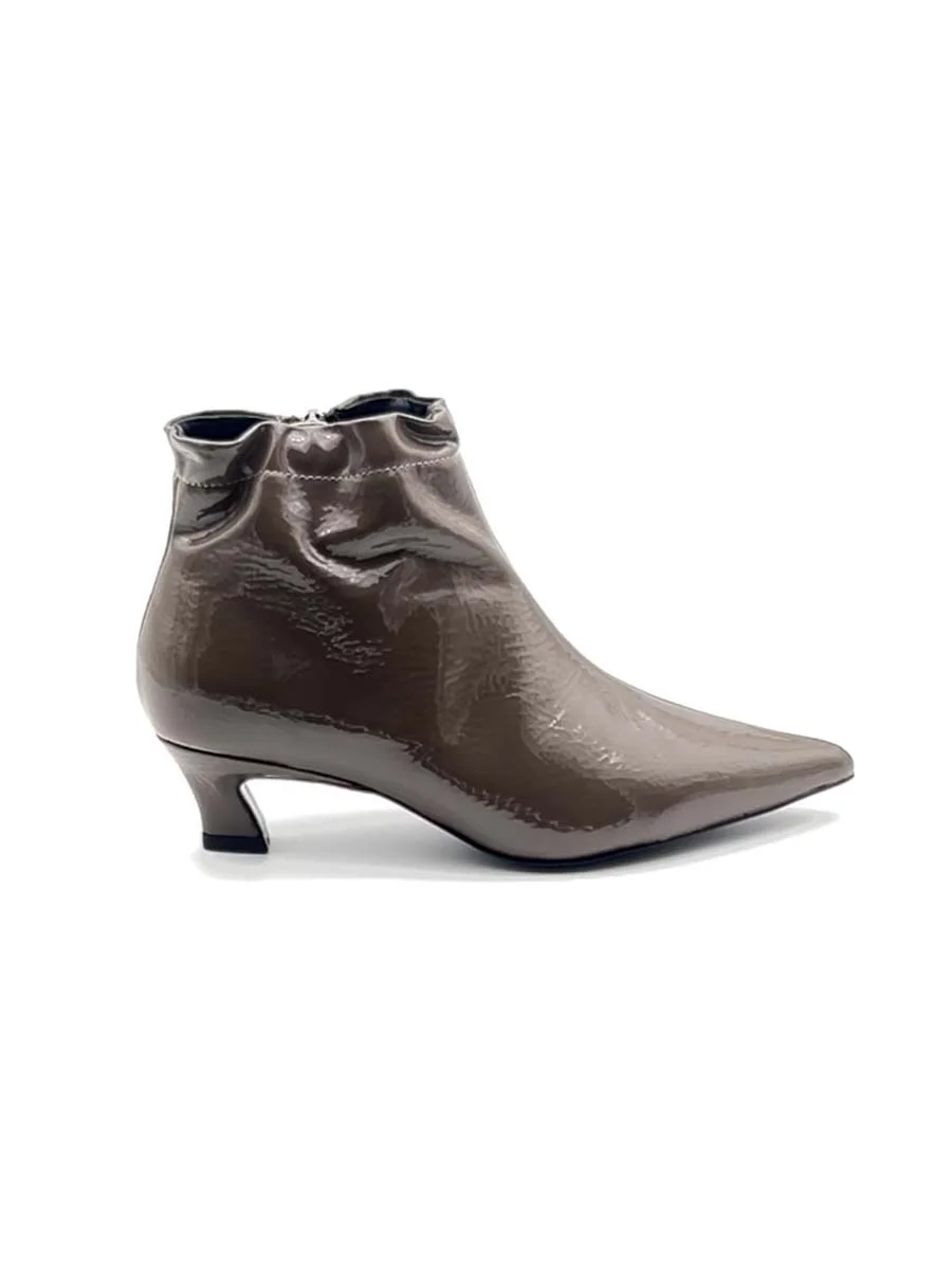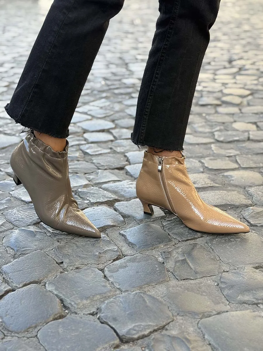 Si chiama “Emma” il nuovo tronchetto di questa stagione, dalla forma a punta, realizzato in morbida vernice fango con zip laterale interna. Tacco cm 4.