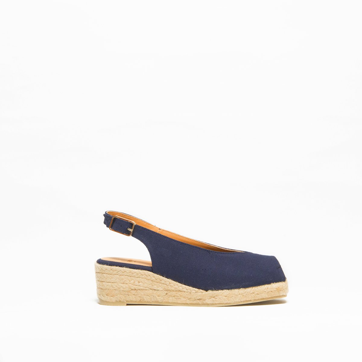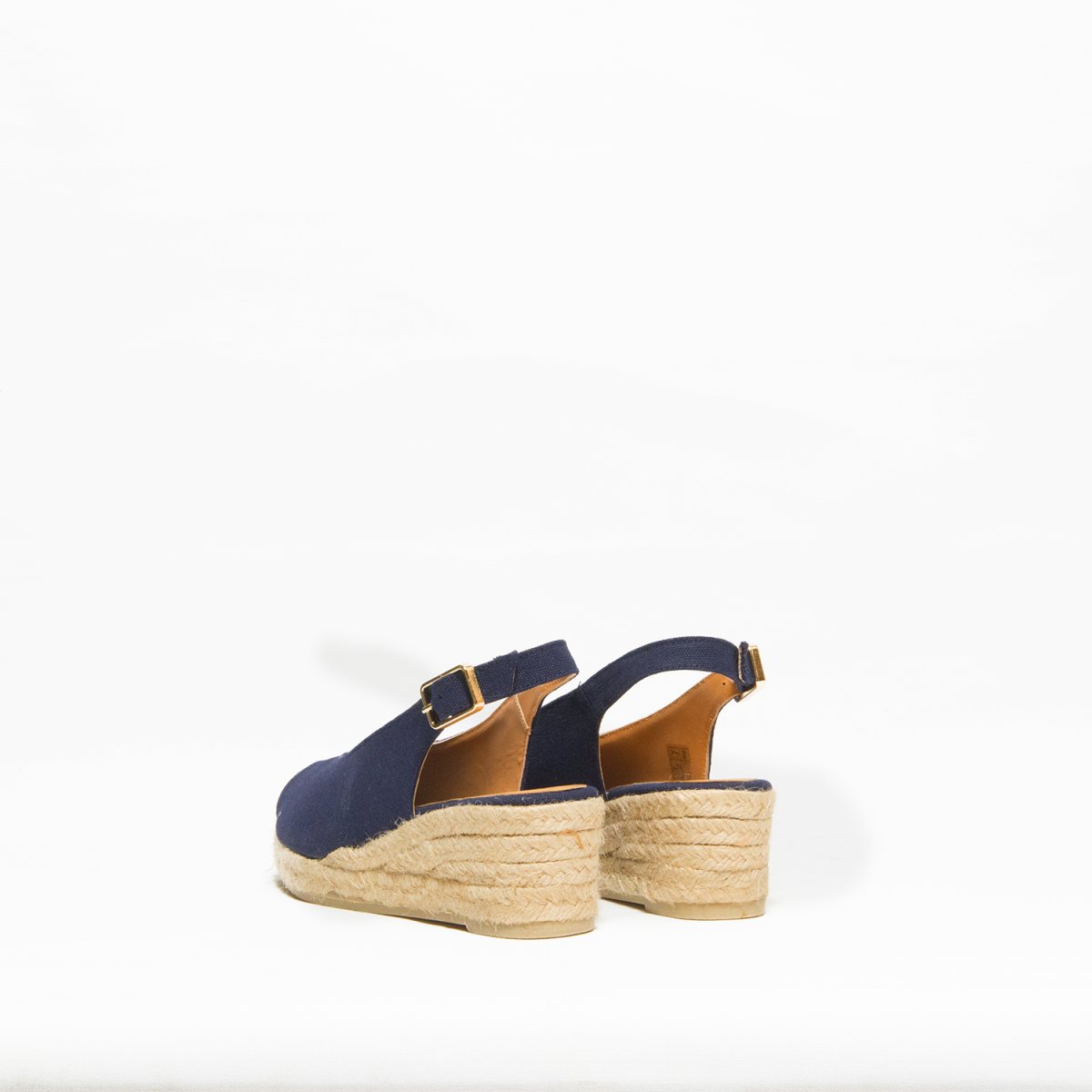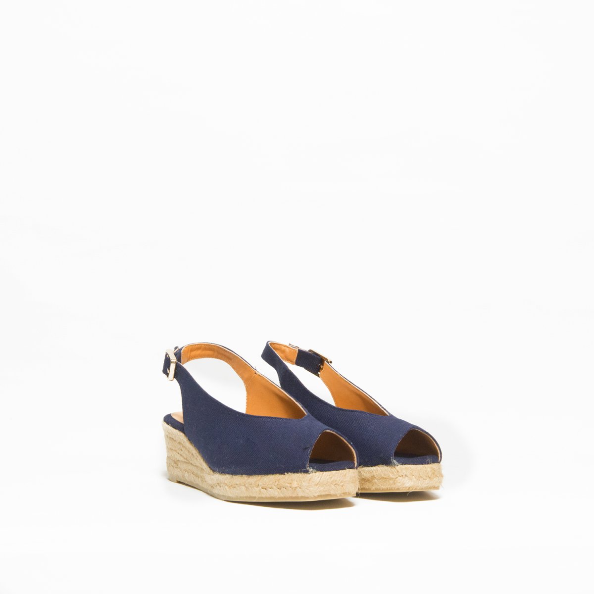 Espadrilla con zeppa a punta aperta in tela di cotone blu mare scollo a v e cinturino con fibbia Suola in juta vulcanizzata in colore naturale e gomma Altezza totale cm 5 e platform cm 1. Calzata regolare