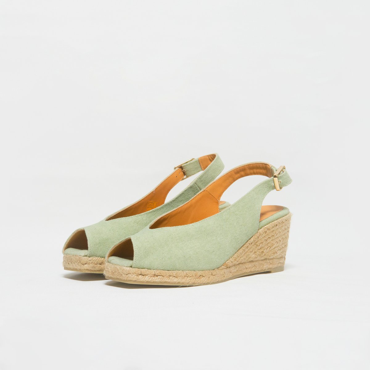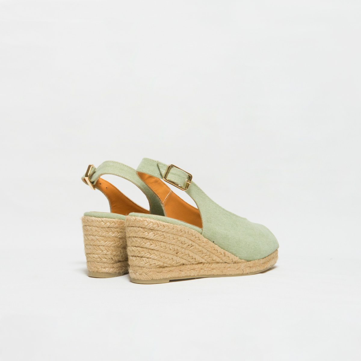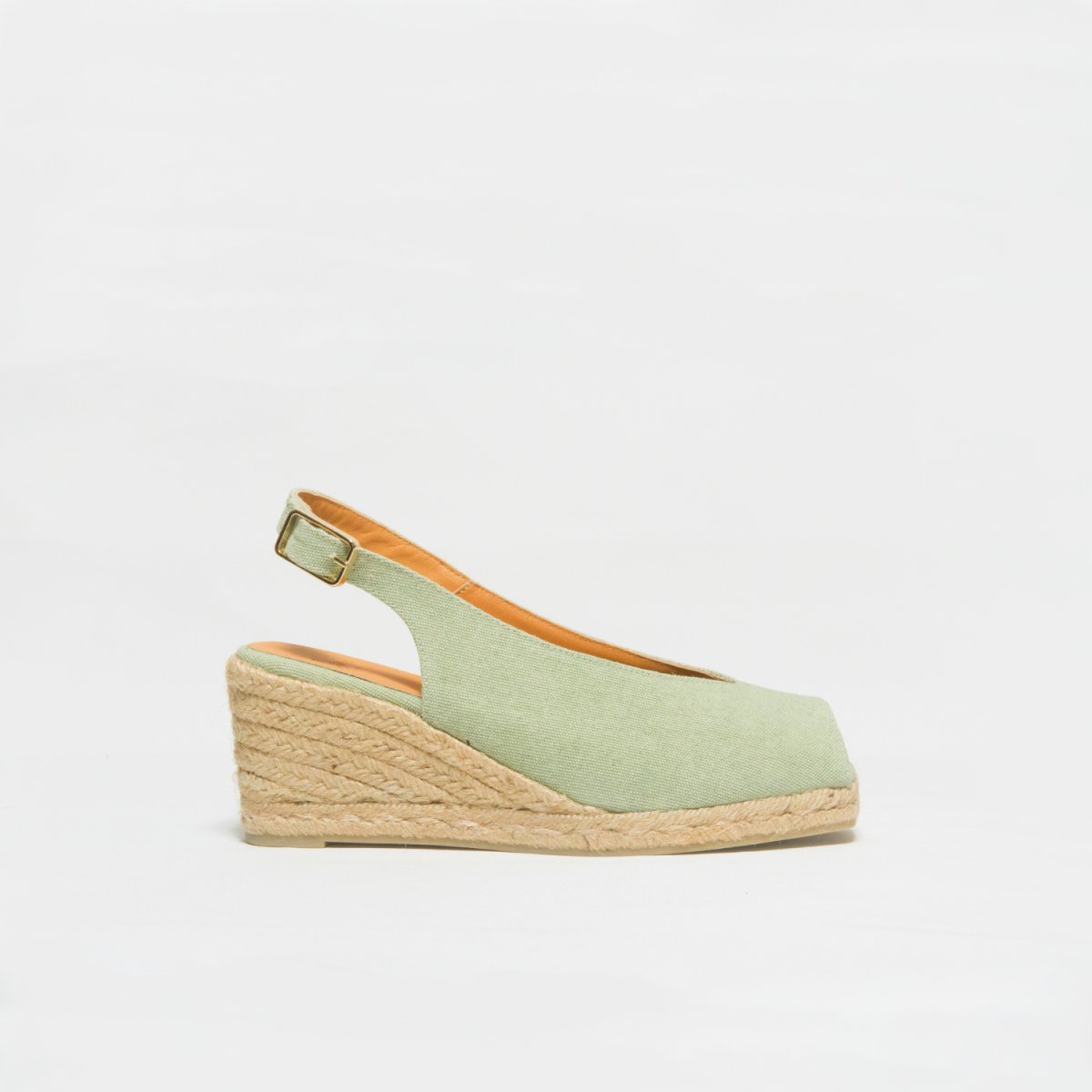 Espadrilla con zeppa a punta aperta in tela di cotone verde acqua. Scollo a v e cinturino con fibbia. Suola in juta vulcanizzata in colore naturale e gomma. Altezza totale cm 7 e platform cm1. Calzata regolare