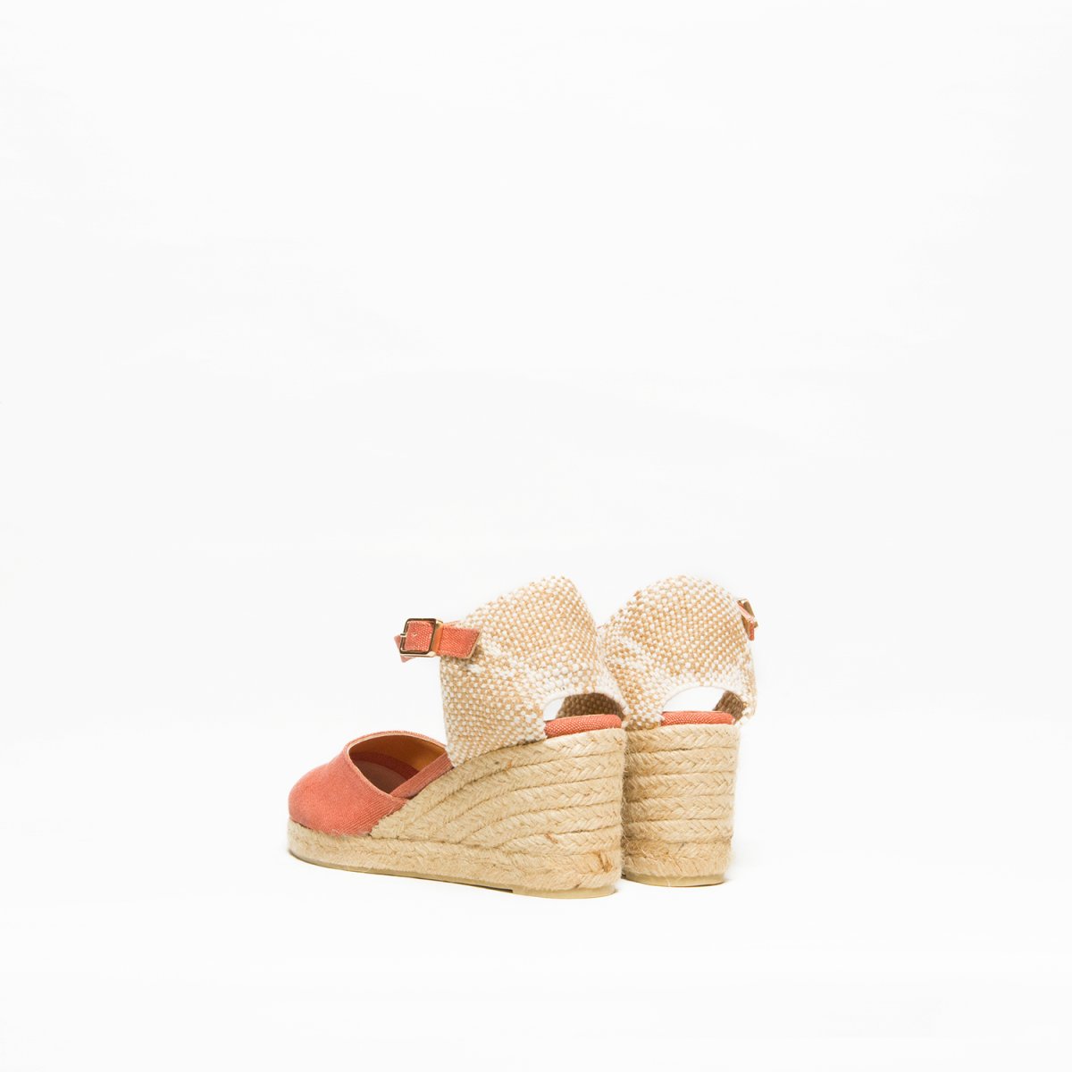 Espadrilla con zeppa in corda e tela di cotone rosa scuro Cinturino alla caviglia con fibbia e tessuto intrecciato beige sul tallone Suola in juta vulcanizzata e gomma colore naturale Altezza totale cm 7