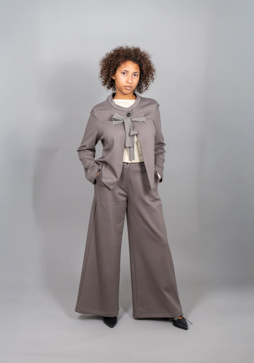 Il maxi fiocco frontale è il dettaglio distintivo che dona carattere al look, mantenendo una linea pulita e moderna.