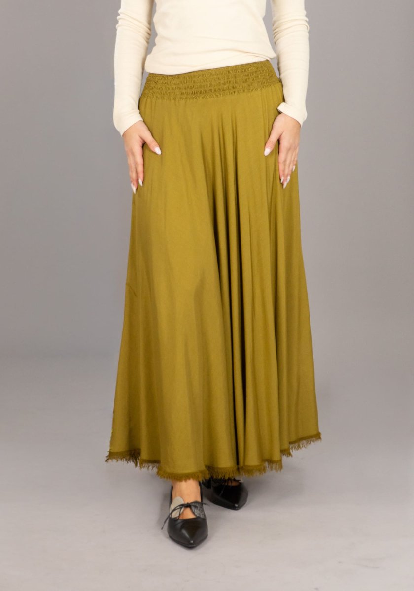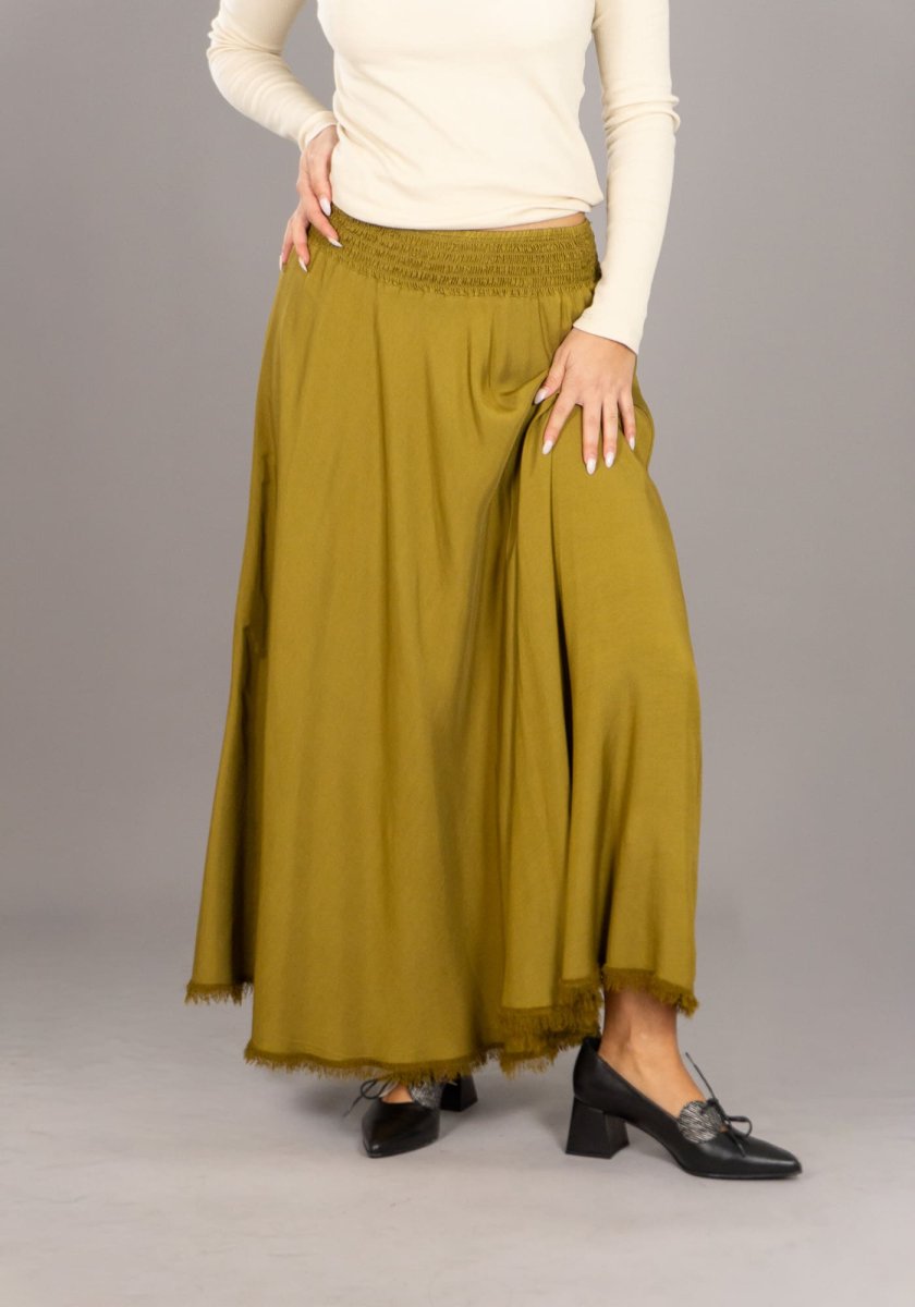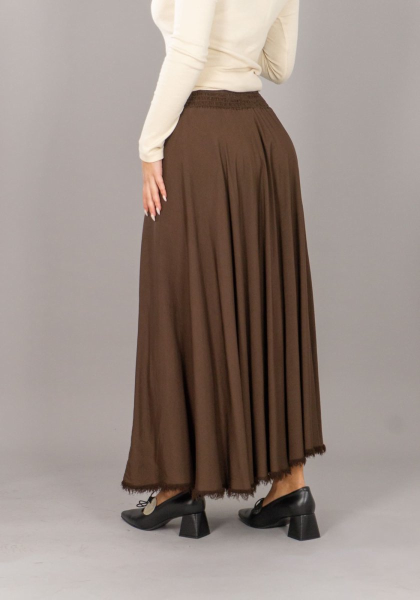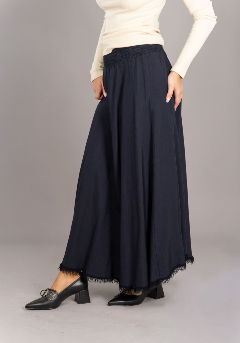 La linea ampia dona un effetto arioso e raffinato, mentre la lavorazione georgette sul fondo aggiunge un dettaglio delicato e femminile. Il punto vita è elasticizzato e arricciato, pensato per offrire comfort e una vestibilità versatile, adattandosi in modo armonioso a diverse fisicità.