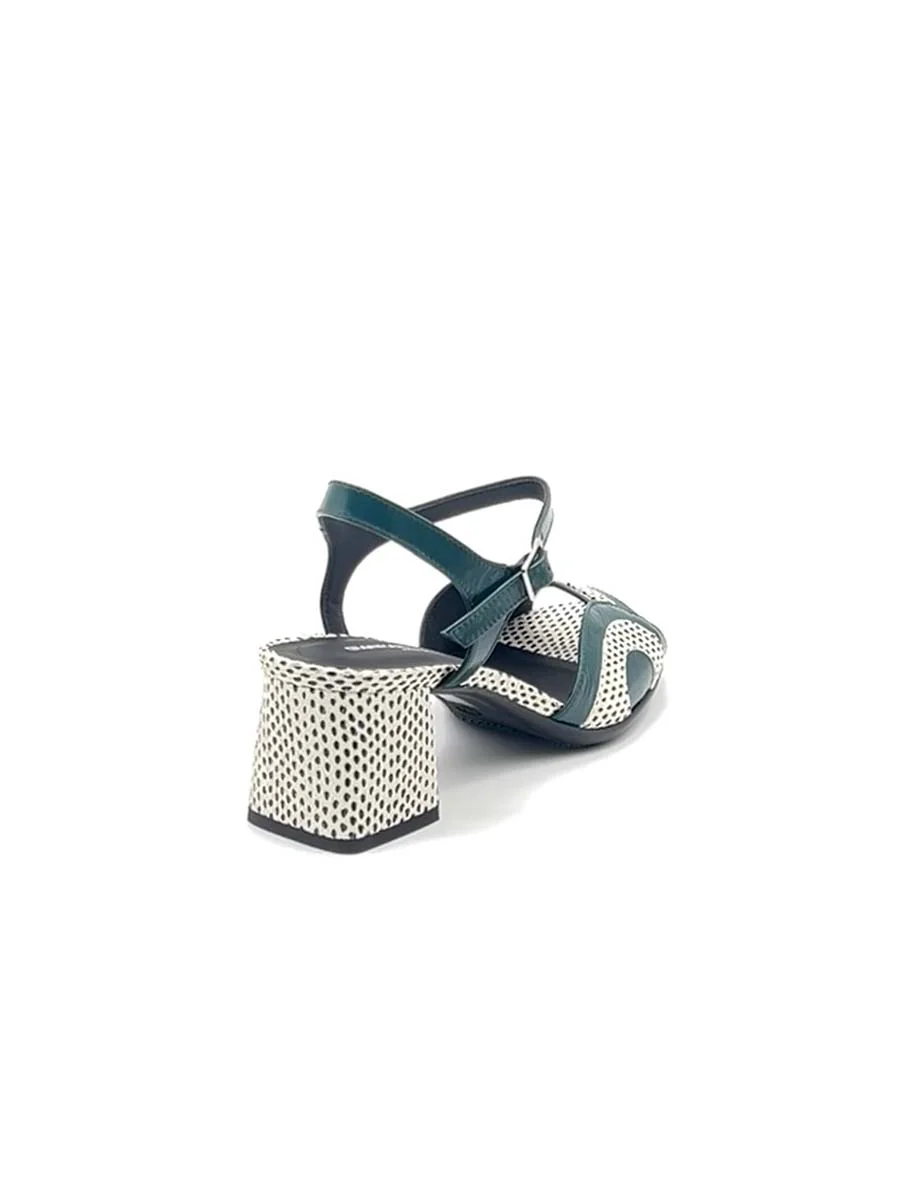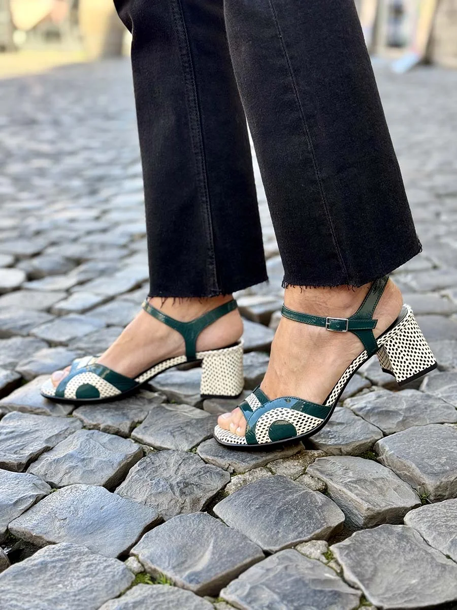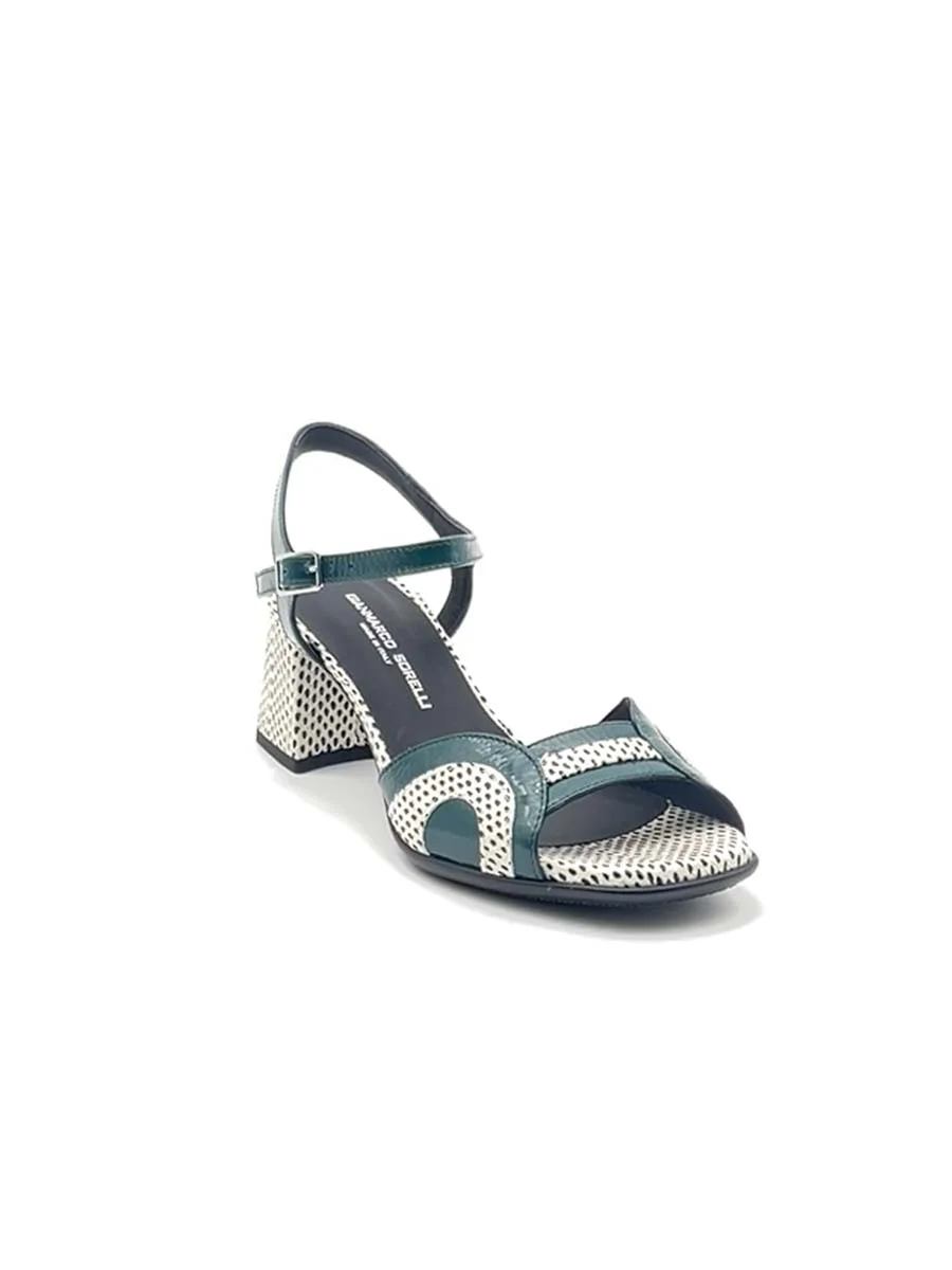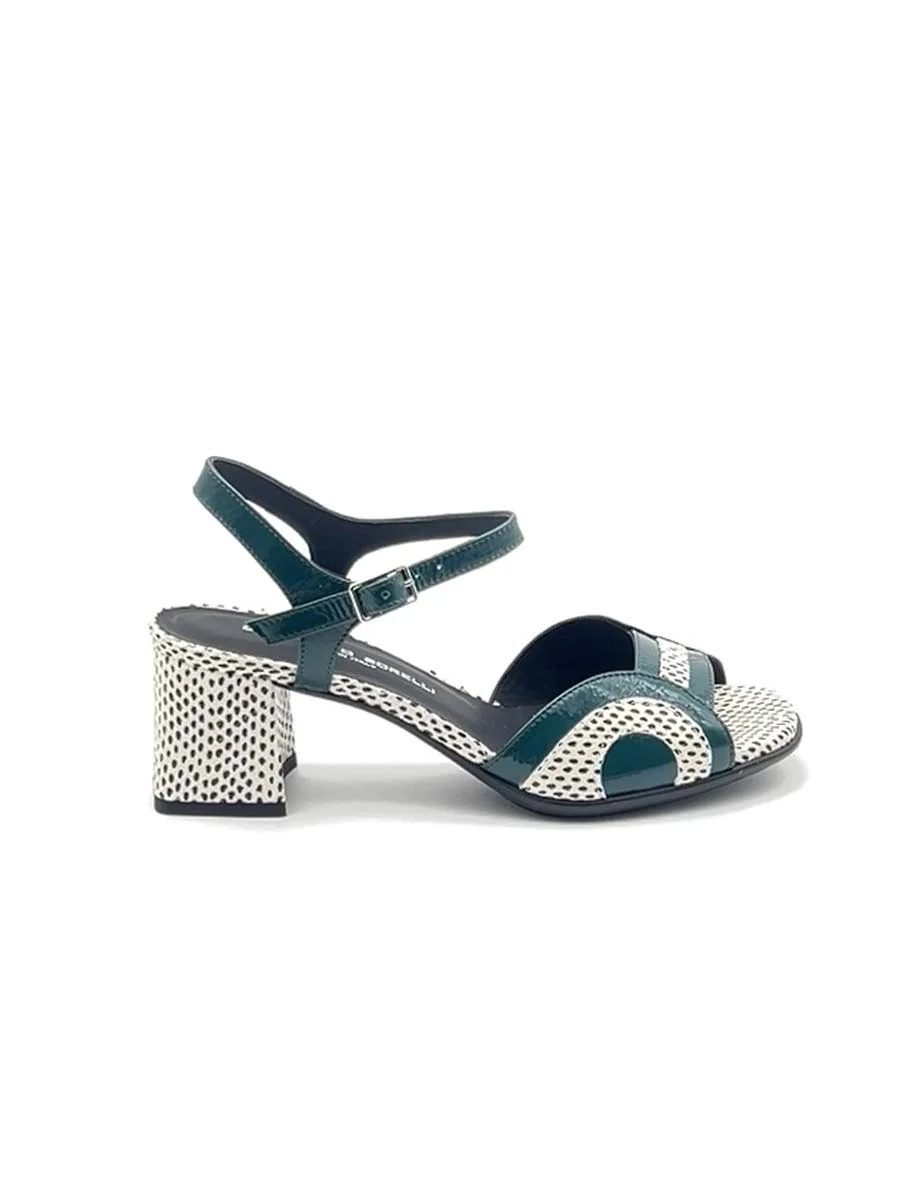 Si chiama “Ida” il nuovo sandalo di “Gianmarco Sorelli”, dalla forma a tonda realizzato in morbida vernice petrolio con tacco, profili e sottopiede a contrasto in pelle puntinata bianca e nera. Tacco cm 5, il fondo è in gomma.