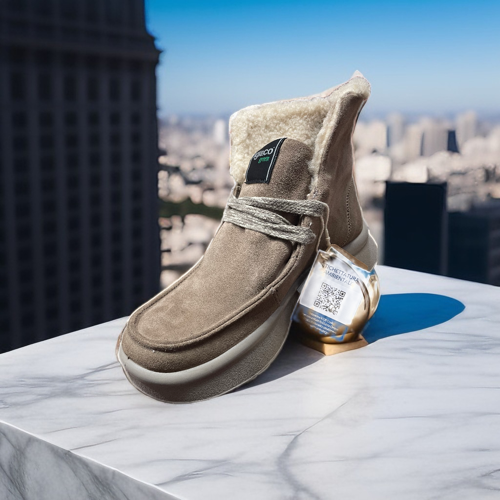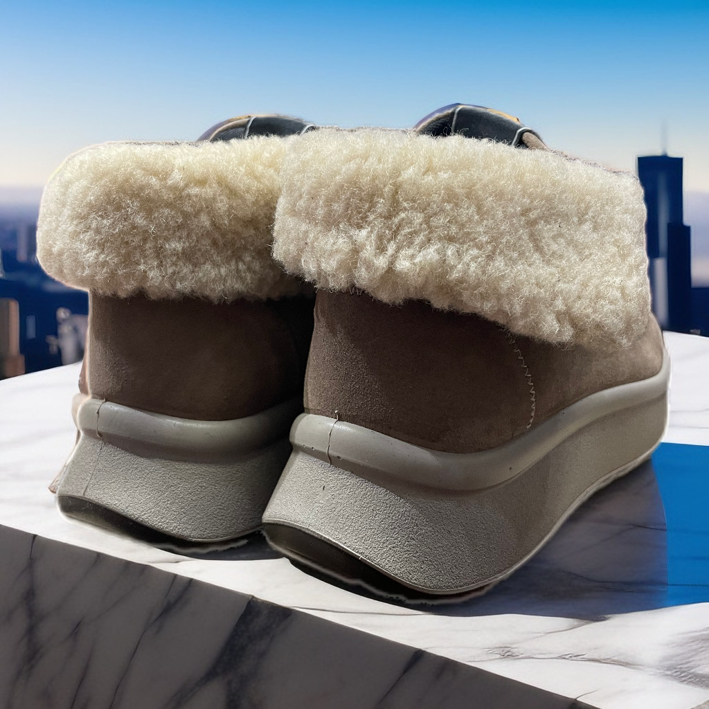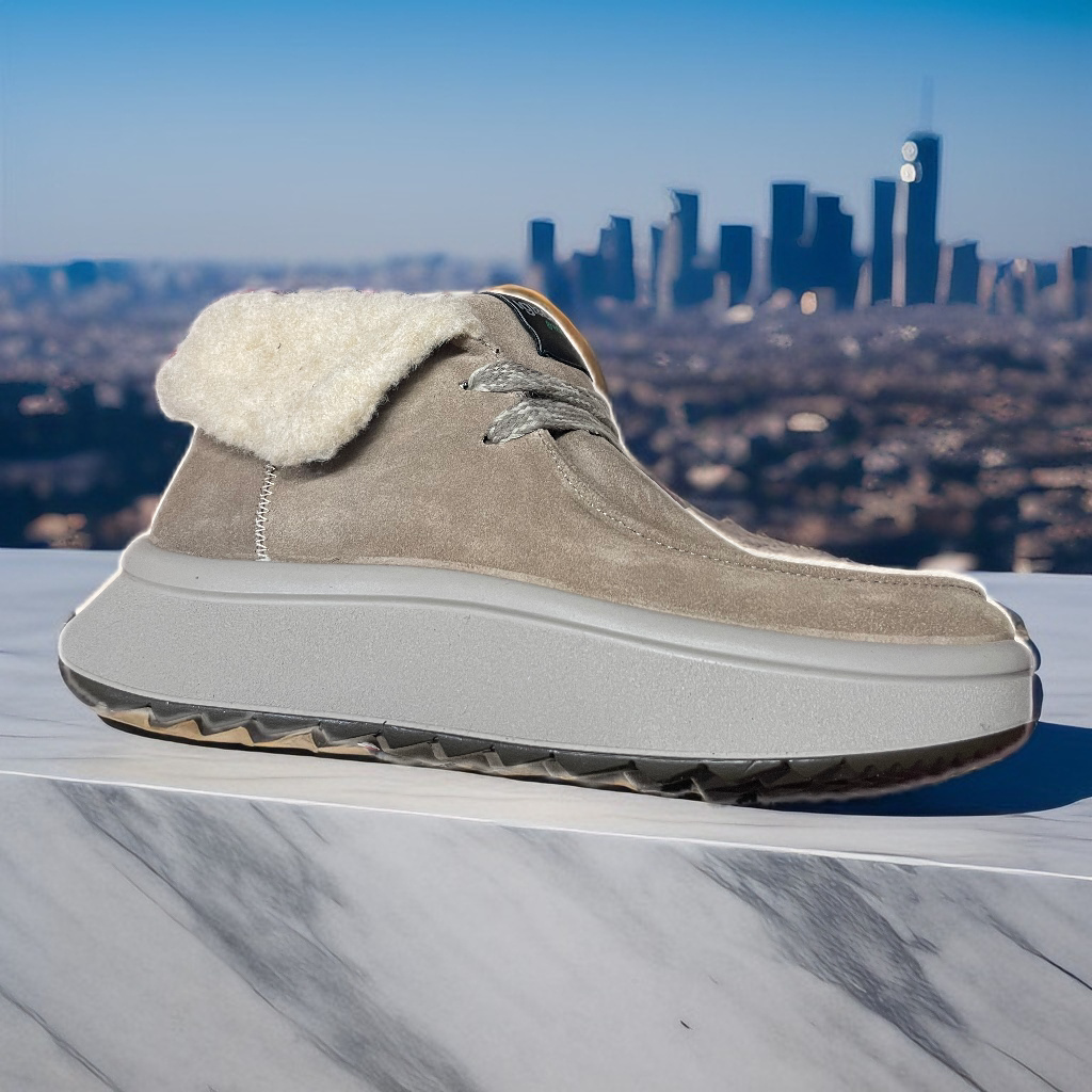 Polacchino modello ingegnere in pelle scamosciata tortora con fodere calde e guarnizioni di eco-pelliccia solo nei lembi risvoltabili alla caviglia. La tipica allacciatura del mocassino modello è costituita da lacci bicolore. La suola alta e leggera è un platform isolante bicolore,