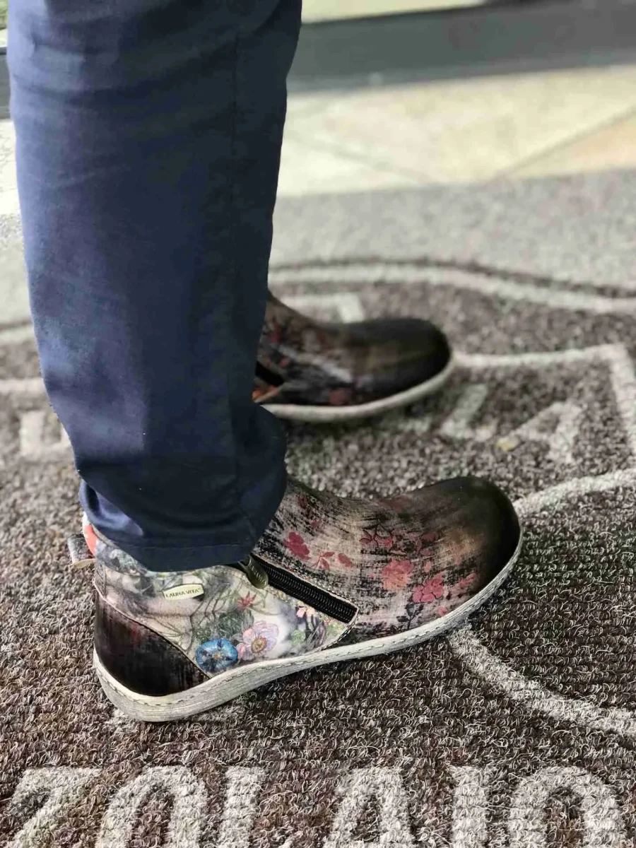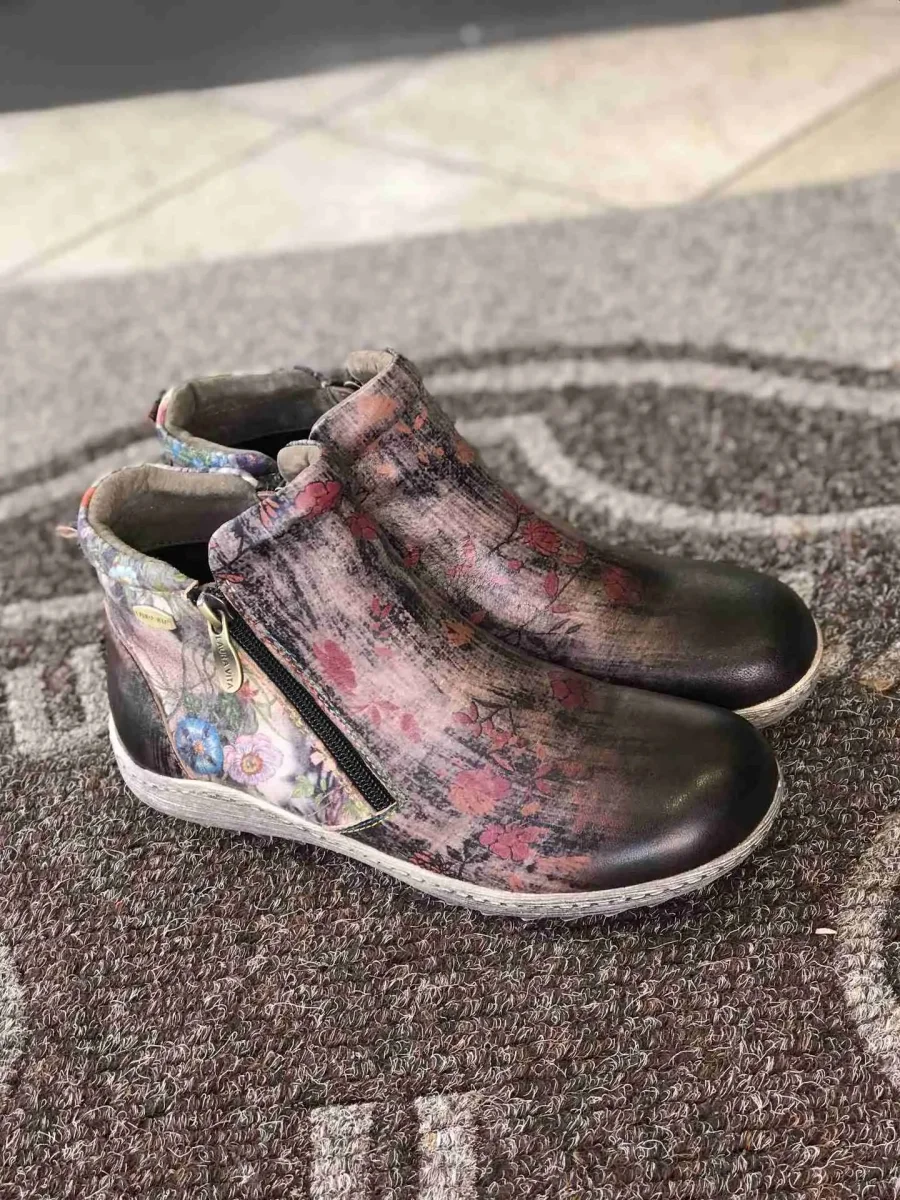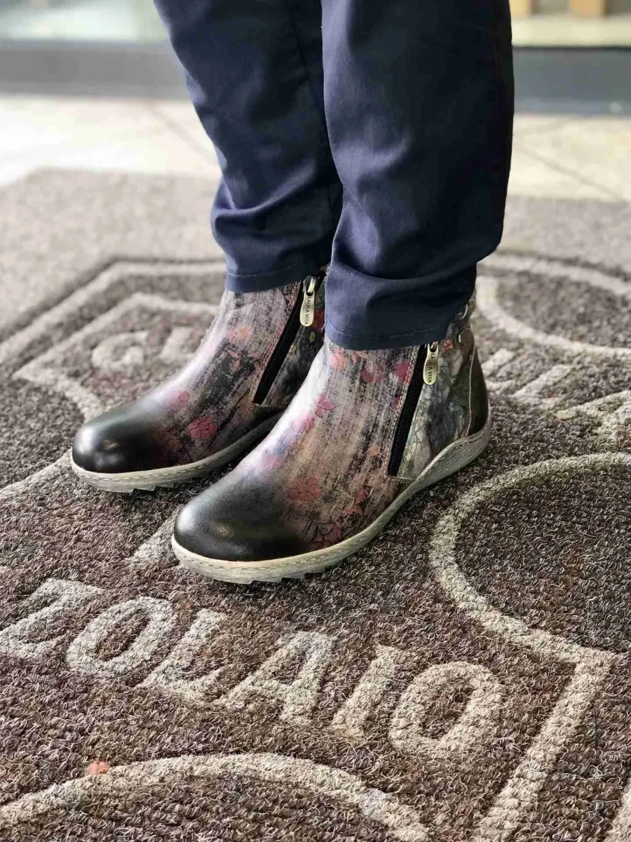 Stivaletto in pelle stampata a fiori multicolori su fondo texture graffiti grigio perla, sperone tinta unita nera, puntale brush oil nero. Ha due zip per essere calzata agilmente. Fodere di pelle e suola di gomma grigia. Una furba imbottitura nel perimetro della caviglia assicura comfort.